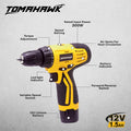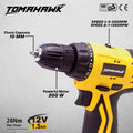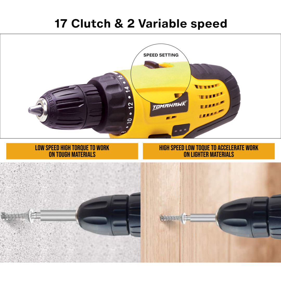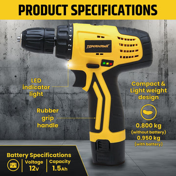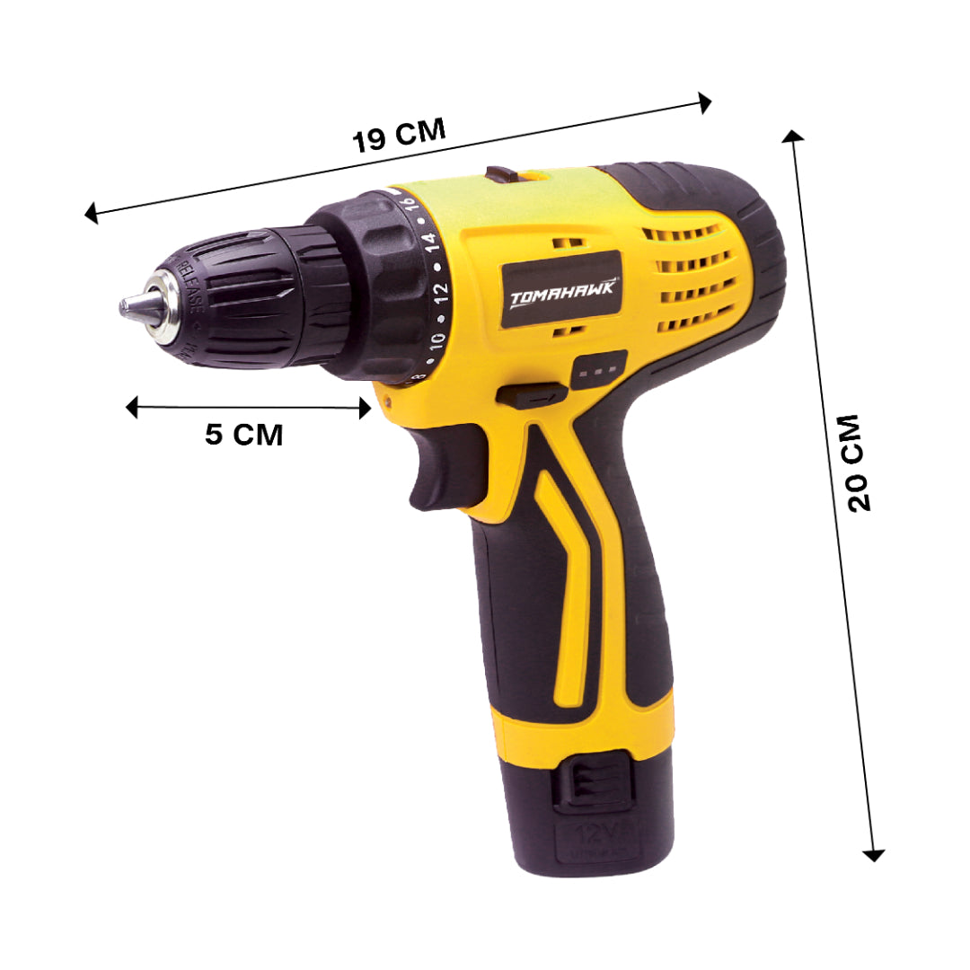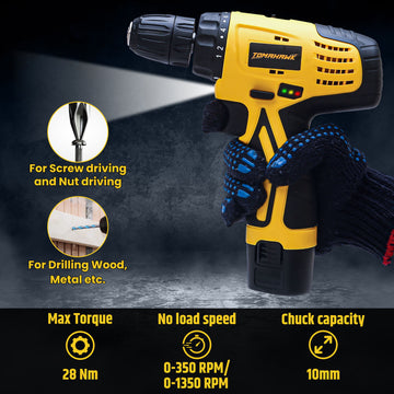 The Tomahawk's T7384 is a versatile 10mm cordless drill machine and screwdriver, designed for precision and power. It features a no-load speed of 0-350/0-1350 rpm, offering a max torque of 28 Nm and 16+1 torque settings, perfect for handling wood, metal, and masonry. Its compact, lightweight design with a rubber grip handle and LED indicator light ensures comfort and visibility for any task, making it an ideal choice for a battery operated drill.