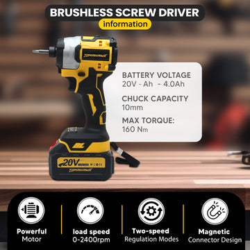 Discover the T-082-BSD Brushless Screwdriver, engineered for excellence with a no-load speed of 0-2400rpm and a 10mm chuck capacity. It delivers a powerful 160Nm of torque, supported by a brushless motor and quality bearing design for peak performance. Features include a magnetic connector, two-speed modes, a high flashlight for visibility, and an advanced cooling system to keep the tool running smoothly.