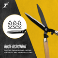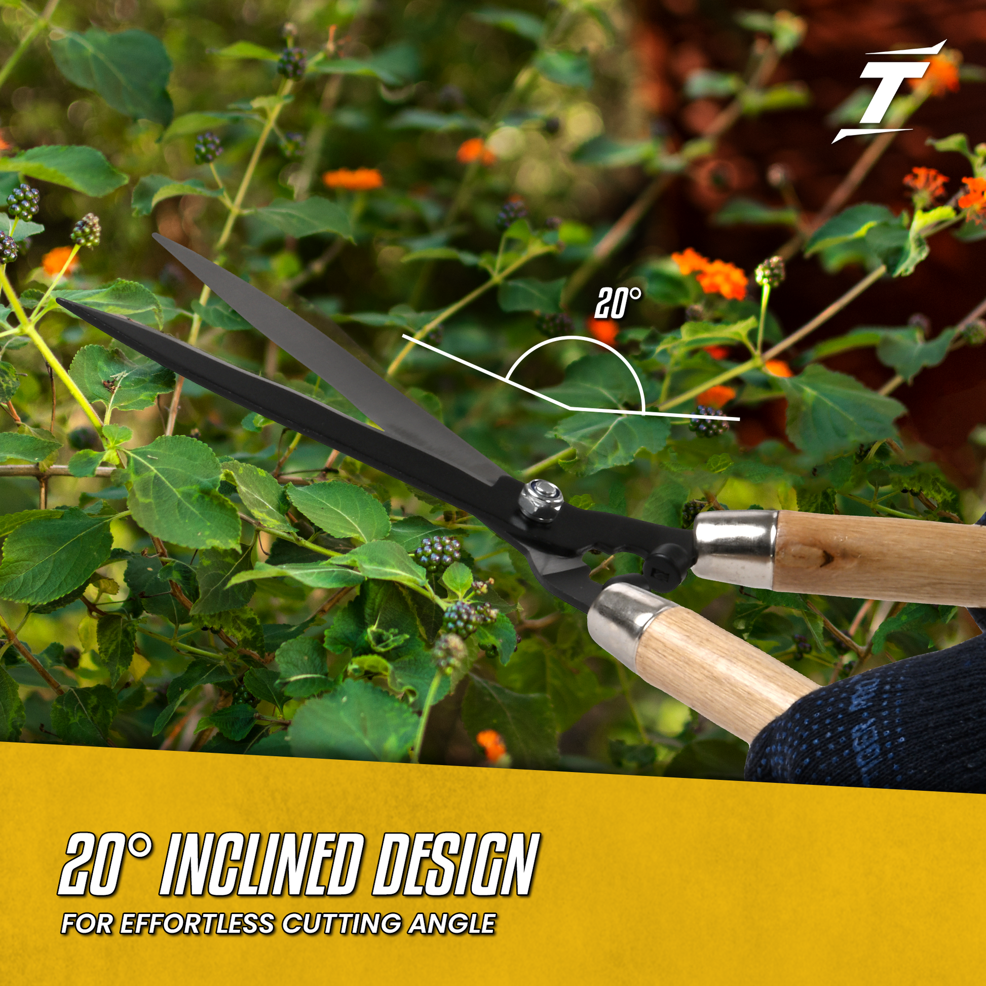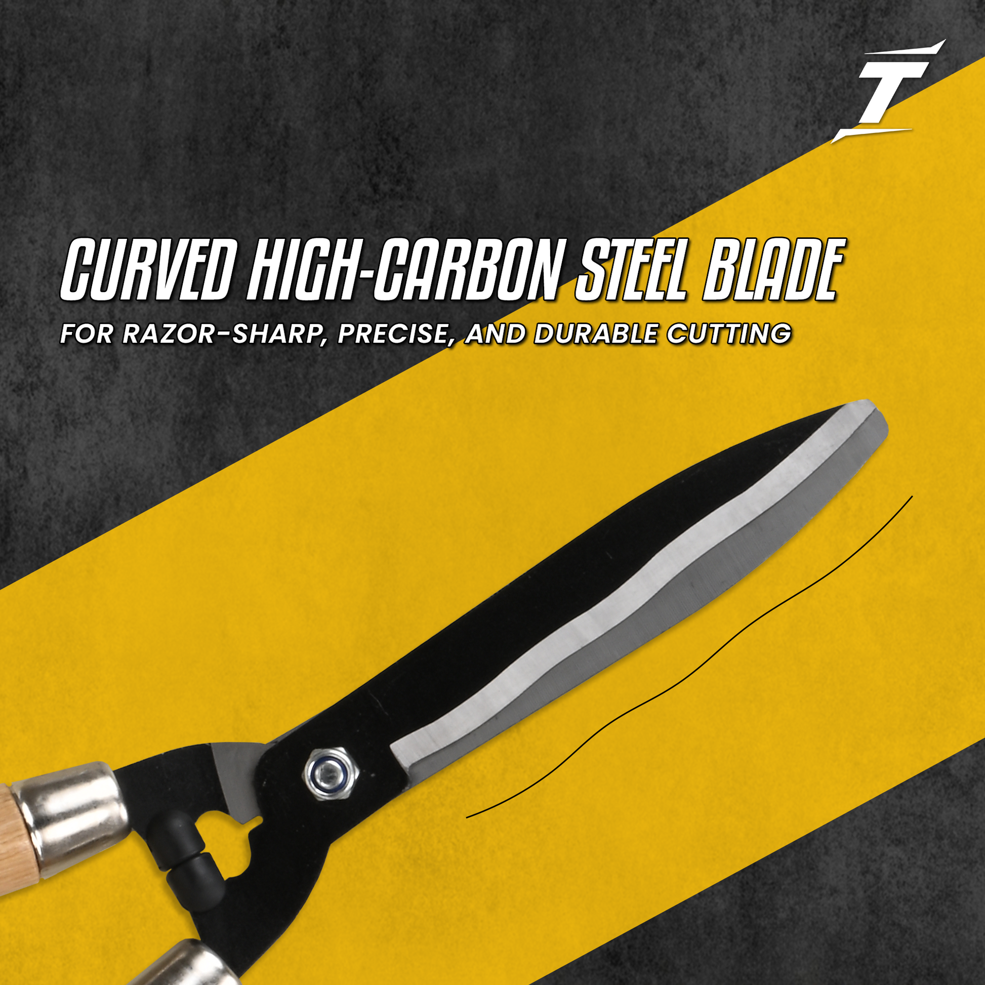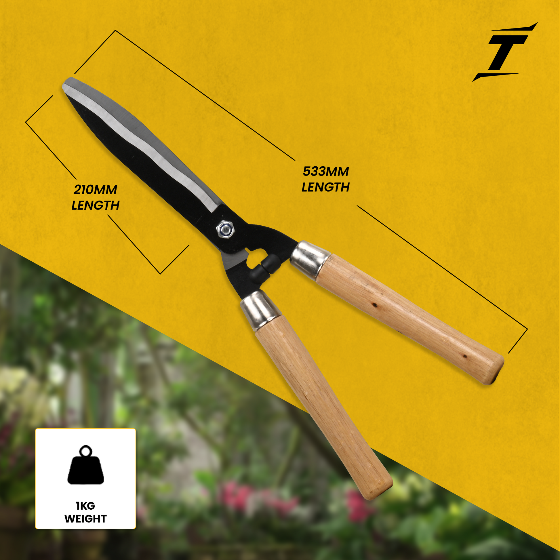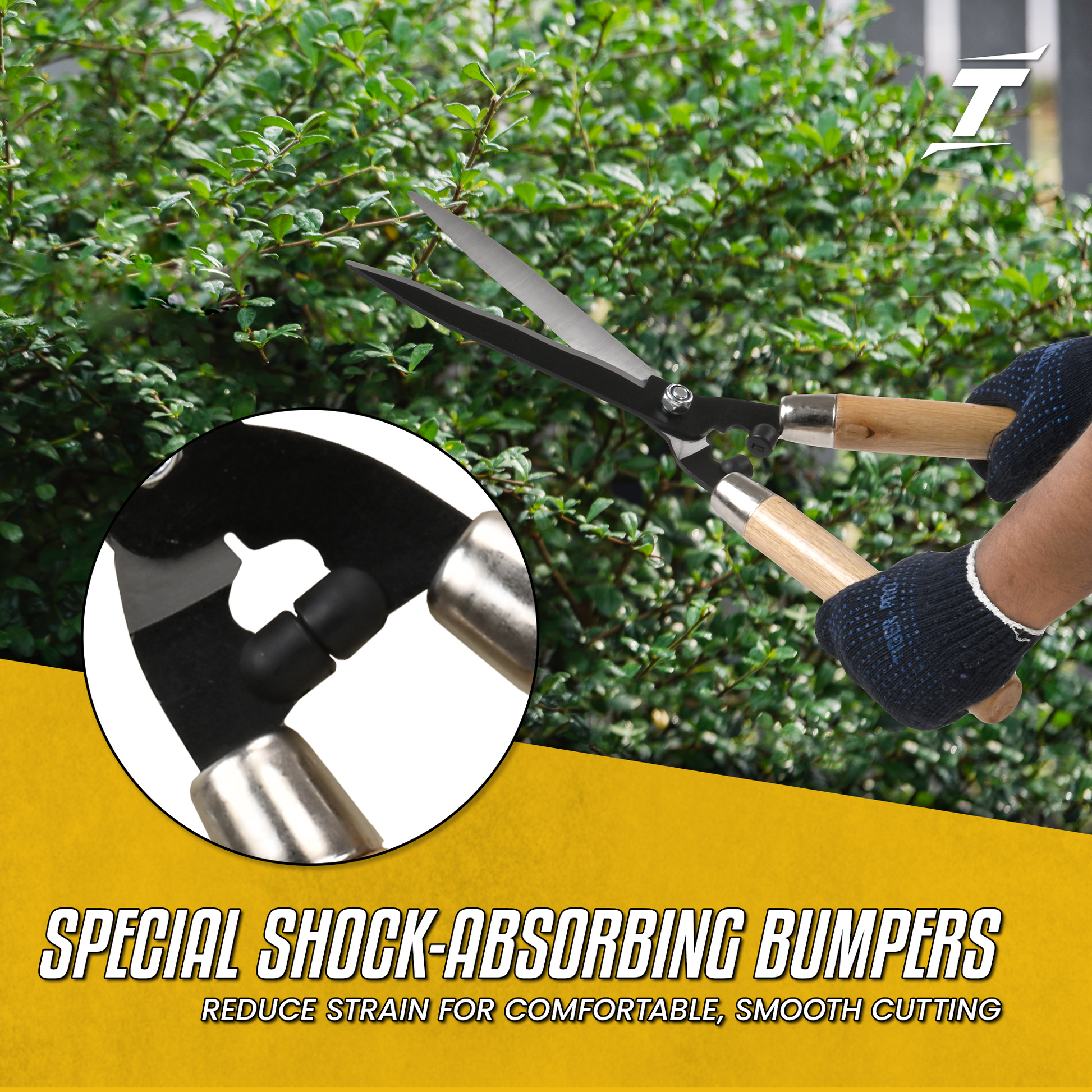 Trim with precision using the TWS21 Hedge Shear, featuring a 270mm curved high-carbon steel blade with Teflon coating for durability and sharpness. Its rust-resistant build, tension control knob, and shock-absorbing bumpers ensure smooth, controlled cuts. The ergonomic wooden handle offers a comfortable grip for extended use. Perfect for shaping hedges with minimal effort and maximum control.