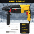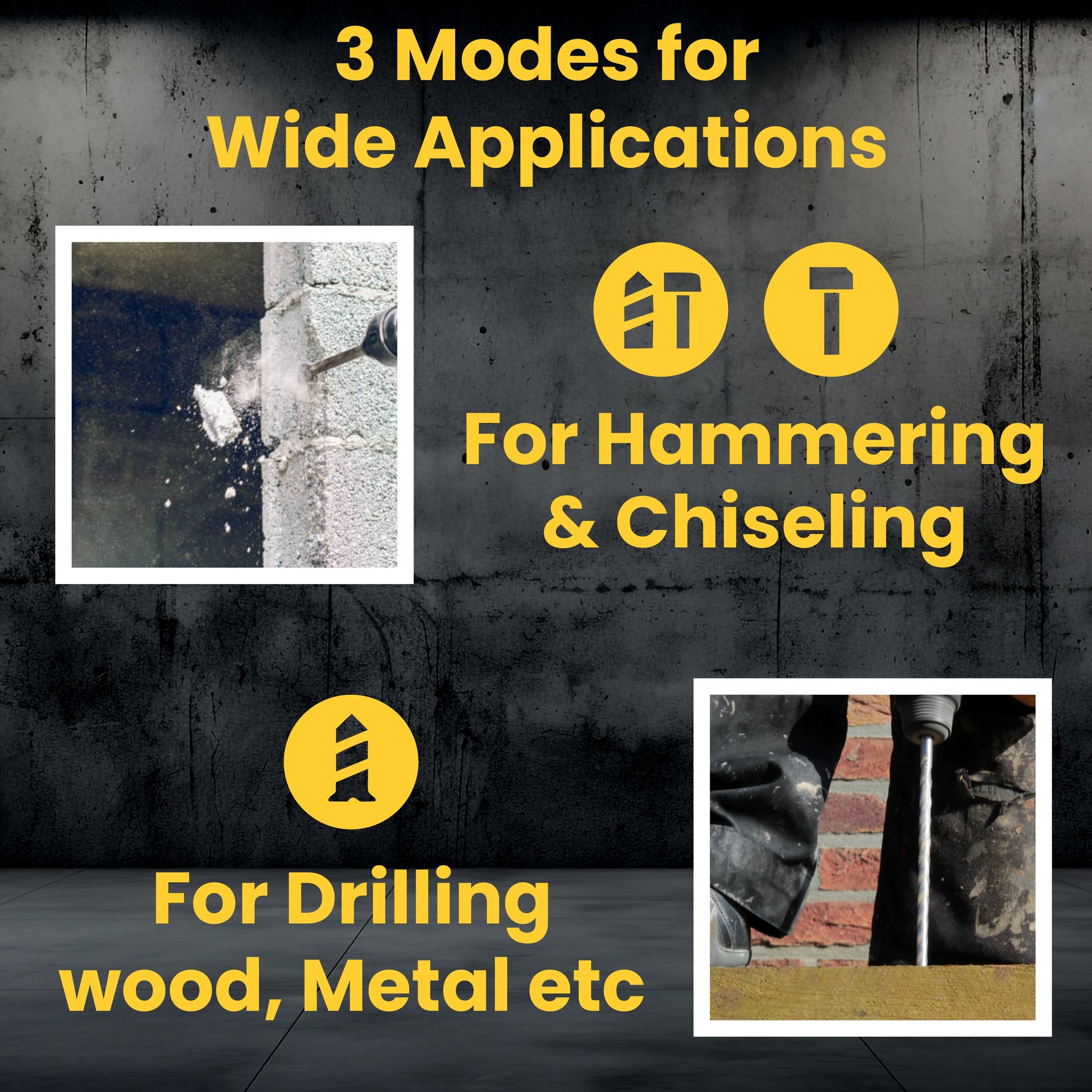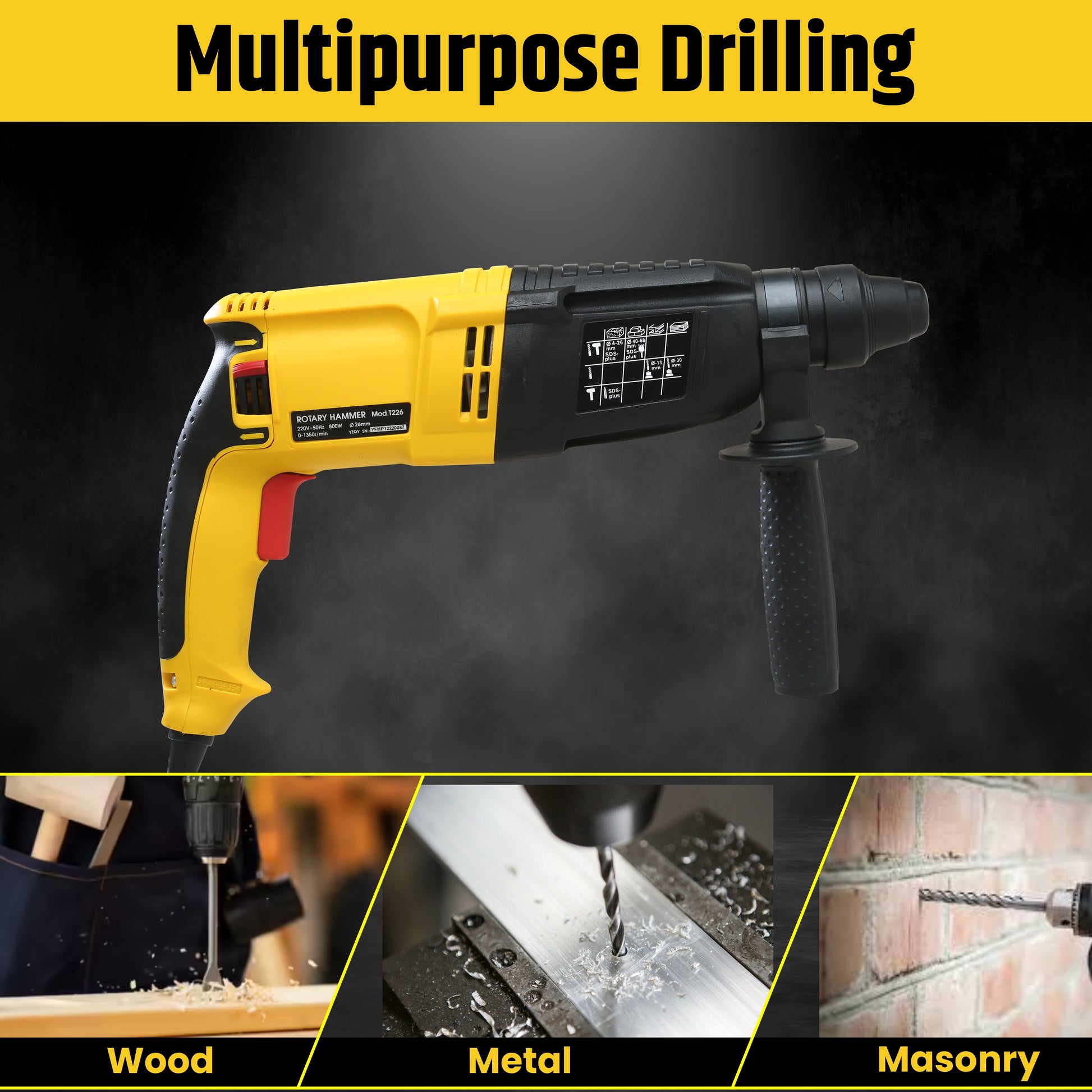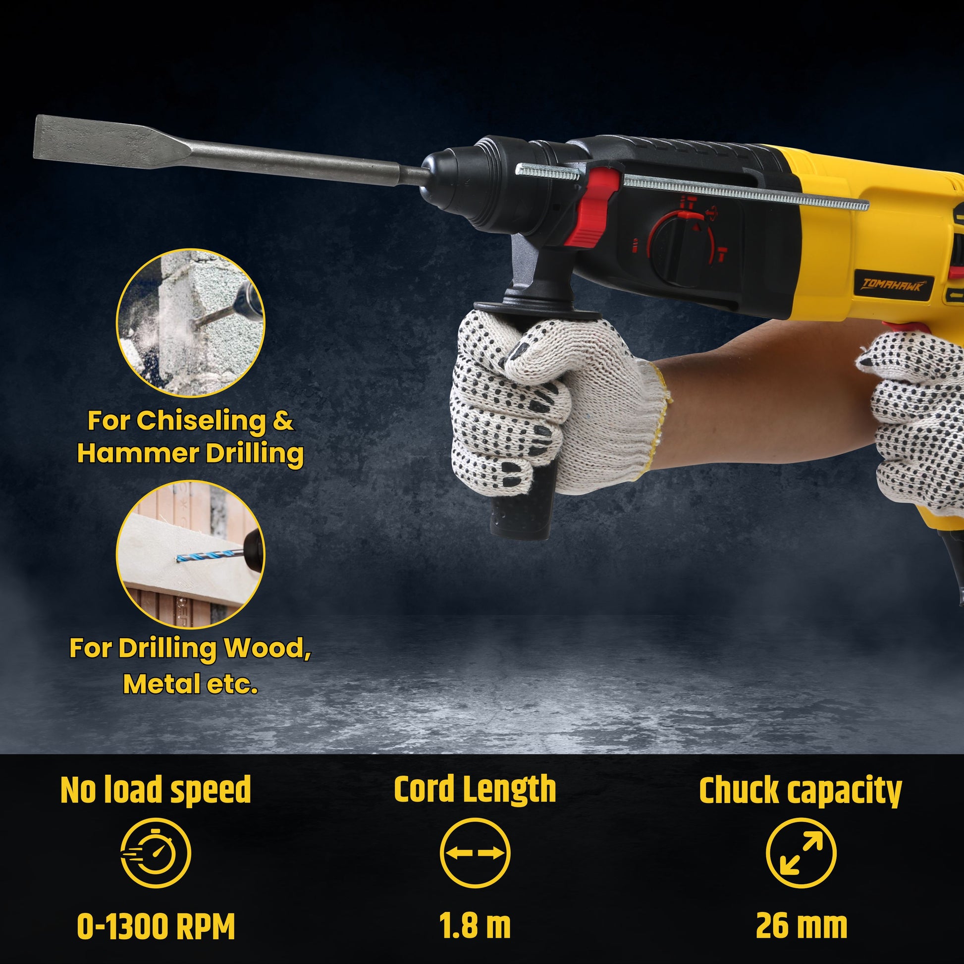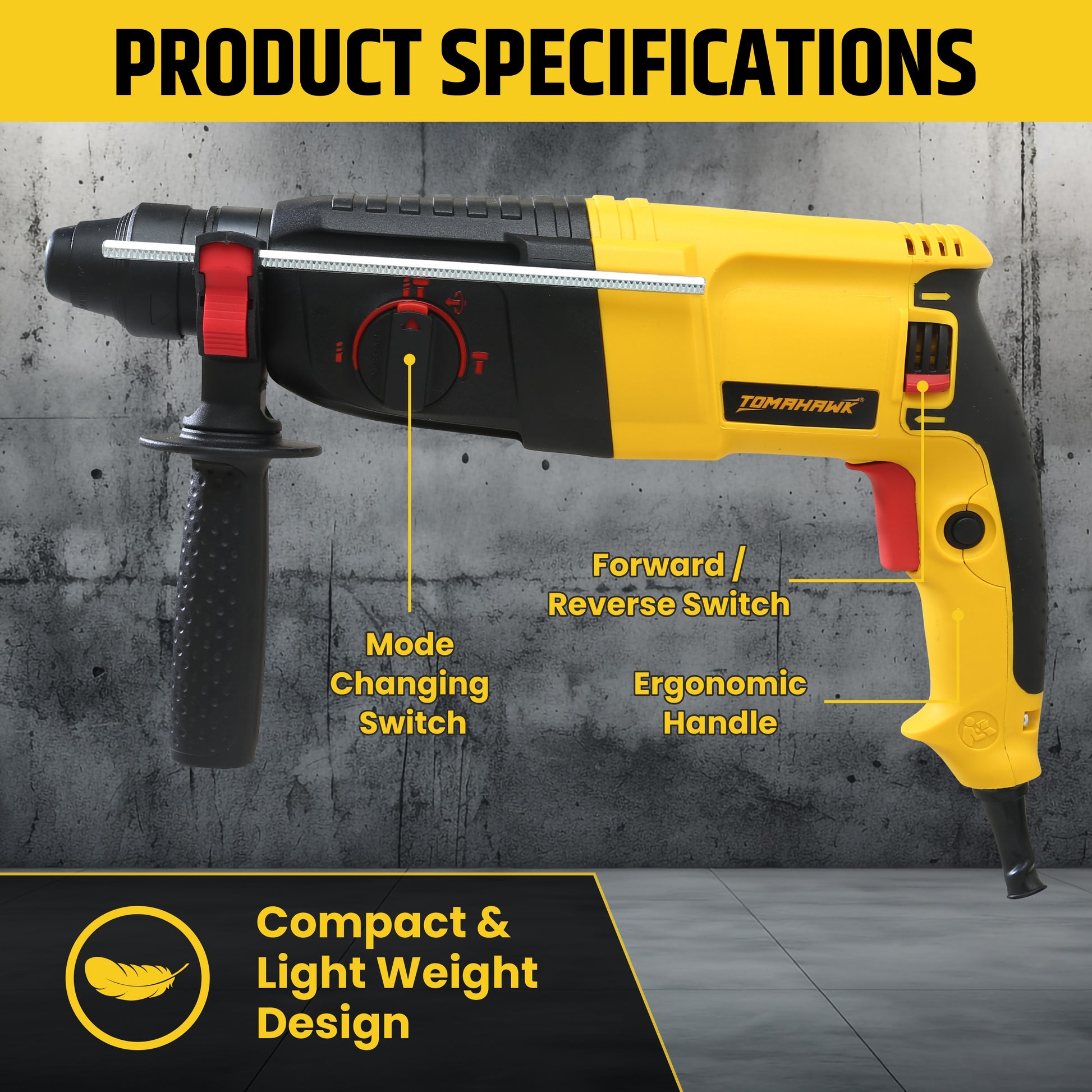 The Tomahawk's T226 Rotary Hammer boasts a robust 800W impact rating with a no-load speed of up to 1300 RPM, ideal for diverse tasks. It features a maximum drilling diameter of 26mm, with drill capacities: 30mm for wood, 13mm for metal, and 10mm for masonry, ensuring versatility across projects. The 1.8m cord length enhances flexibility, while the lock switch and reversible function boost user control. Select from three modes—drilling, hammering, and chiseling—for tailored performance in any application.