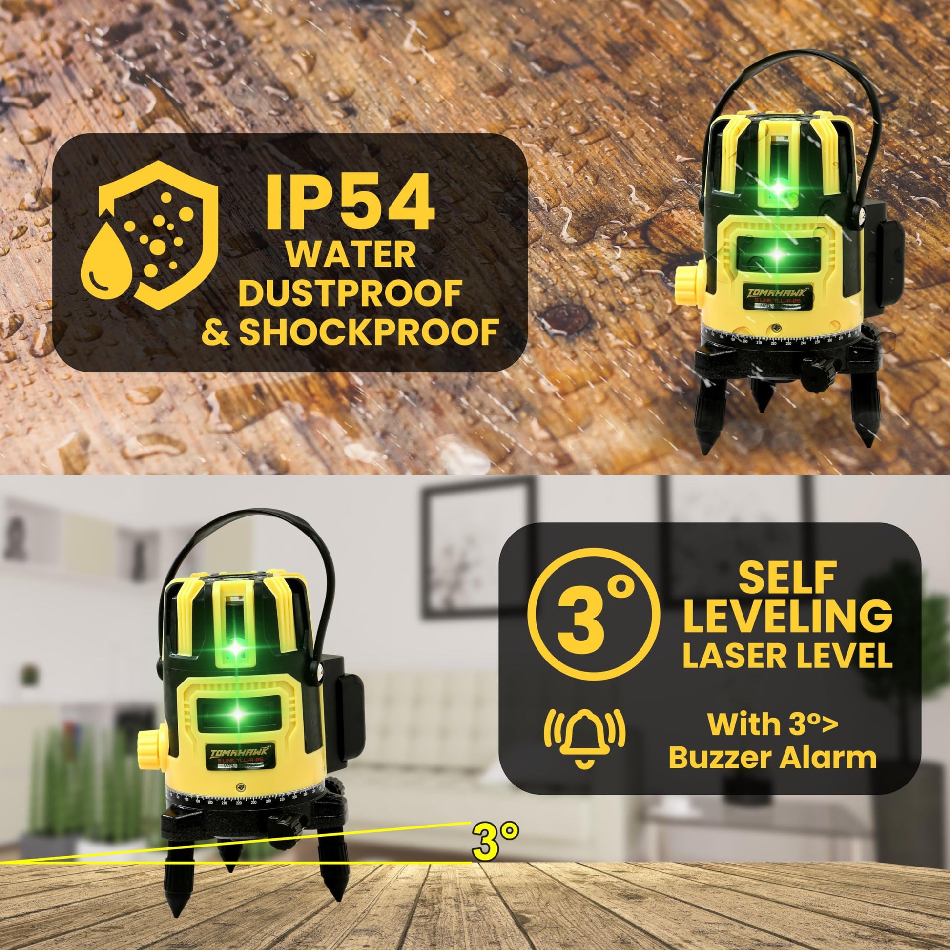 - The Tomahawk Plastic Professional 5-Line 3D Line Laser Cross Self Leveling Laser Level is a versatile tool designed to make leveling and alignment tasks easier. It features five green laser lines, including one horizontal and four vertical, creating a precise cross-line pattern for accurate layout and alignment. The self-leveling function ensures precise leveling even on uneven surfaces, and the bright green laser lines are easily visible in various lighting conditions. With a 360-degree rotation capability and adjustable brightness, this laser level is suitable for a wide range of applications, including construction, remodeling, and DIY projects.