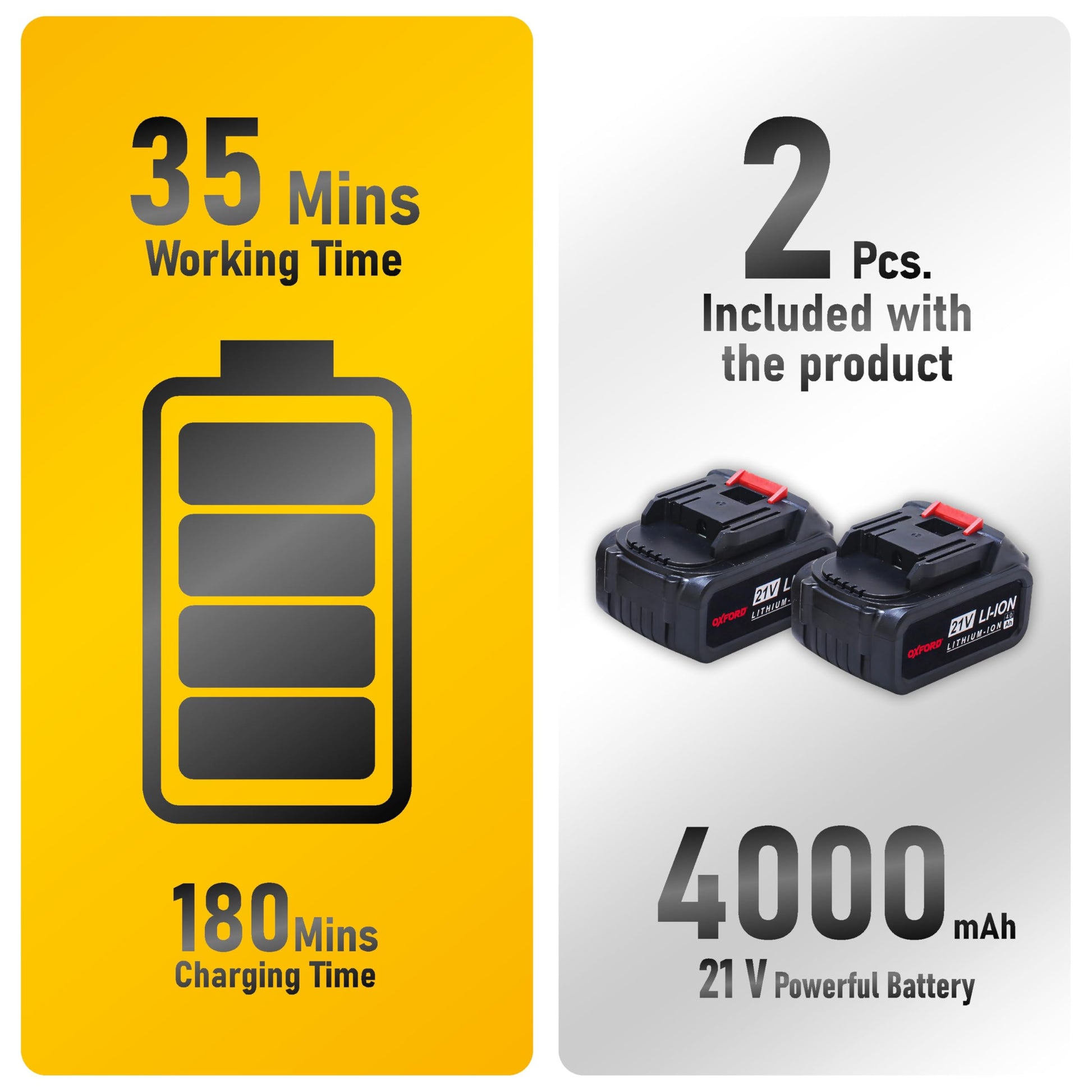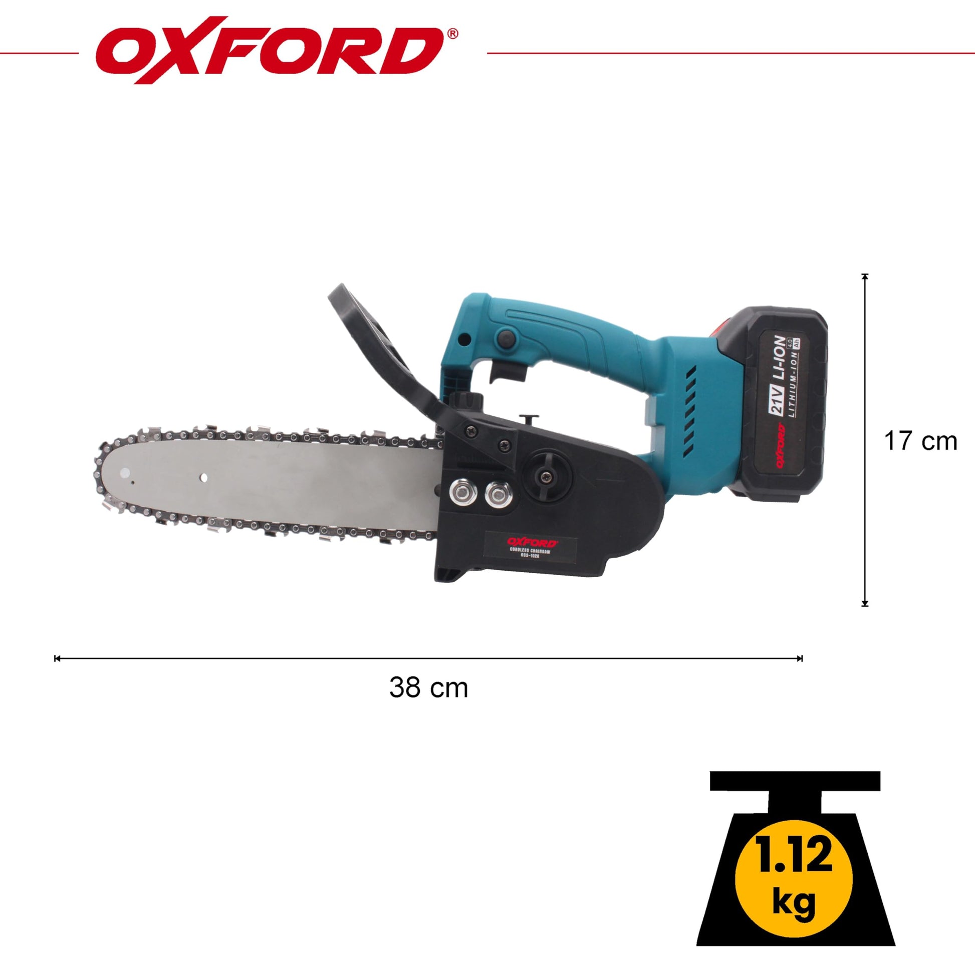 - Experience unmatched cutting precision and efficiency with the Oxford O-32-A-4 Cordless Chainsaw. Boasting a shear length of 230mm and a guide bar length of 260mm, this chainsaw delivers exceptional performance in wood processing, logging, and pruning tasks. Its impressive cutting depth of 100mm, combined with a chain speed of 5.5 meters/second and a 14 teeth chain with 28 joints, ensures smooth and rapid cuts through various materials. Powered by a 20V *1.5Ah 5C battery, this cordless chainsaw offers the convenience of portability and extended usage time. With a no-load usage time of 35 minutes and a load usage time of 20 minutes, you can tackle your projects with ease and efficiency. The included normal charger with 0.5A capacity fully charges the battery in just 180 minutes, minimizing downtime and maximizing productivity. Safety is paramount, and the Oxford chainsaw features dual switch safety start, a safety handle, and a convenient sling attachment for added control and comfort during operation. Weighing less than 1.1kg with the battery, it is lightweight and easy to maneuver, making it ideal for both professional and DIY use. Enjoy quiet and efficient cutting with the high-performance motor, while the included accessories such as two batteries, a charger, a screwdriver, and BMC box provide everything you need for a seamless cutting experience. Whether you're working in gardens, farms, or plantations, the Oxford O-32-A-4 Chainsaw is your go-to tool for precision, power, and portability. Experience the difference in cutting performance and efficiency with this reliable and versatile chainsaw.