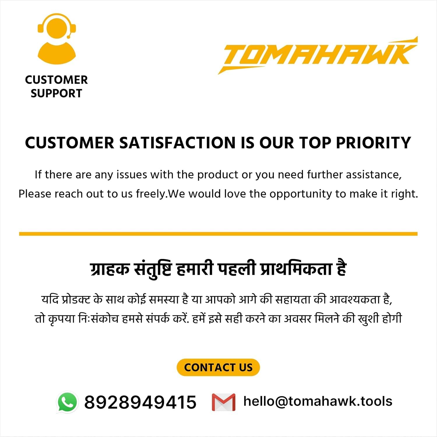 Country of Origin: P.R.C. For consumer complaints write to the Manager at the above address Or call us on +919930090896 or email us at care@tomahawk.tools
