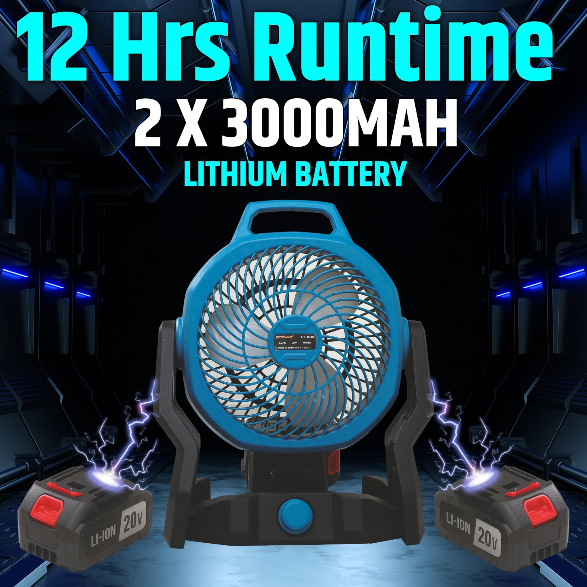 - The TCF0040 Cordless Fan is a versatile and portable cooling solution designed for both indoor and outdoor use. Its compact and lightweight design, combined with a durable ABS body and a convenient carry handle, makes it easy to transport and set up wherever cooling is needed. Equipped with an adjustable angle and a variable speed control knob, this fan provides personalized airflow control for maximum comfort. Powered by two 20V 3Ah Lithium-Ion batteries, it offers long-lasting performance without the need for a power outlet, making it perfect for workshops, outdoor events, or emergency situations.