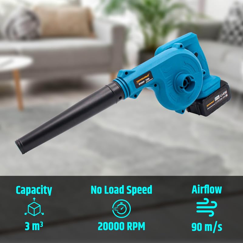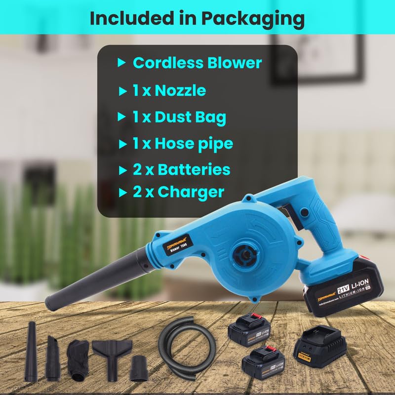 - The TOMAHAWK T500 Cordless Blower is a versatile, high-performance tool designed for a variety of tasks, from construction sites to gardening and landscaping. Featuring a durable 21V pure copper motor, this blower delivers powerful airflow with speeds of up to 150km/hr and a maximum air volume of 125 CFM, making it ideal for dust blowing and debris removal. Equipped with a 3.0Ah rechargeable battery, enjoy uninterrupted usage for up to 40 minutes on a single charge. The fast charging feature ensures minimal downtime, with full charging achieved in just 2 hours. Its self-lock button provides a comfortable, continuous operation, reducing hand fatigue during extended use. The TOMAHAWK T500 is built with durability and convenience in mind, boasting lightweight construction (just 1.4kg with the battery) for easy handling. Whether you're working in tight spaces or large outdoor areas, this cordless blower delivers reliable performance, making it a must-have tool for professionals and homeowners alike.