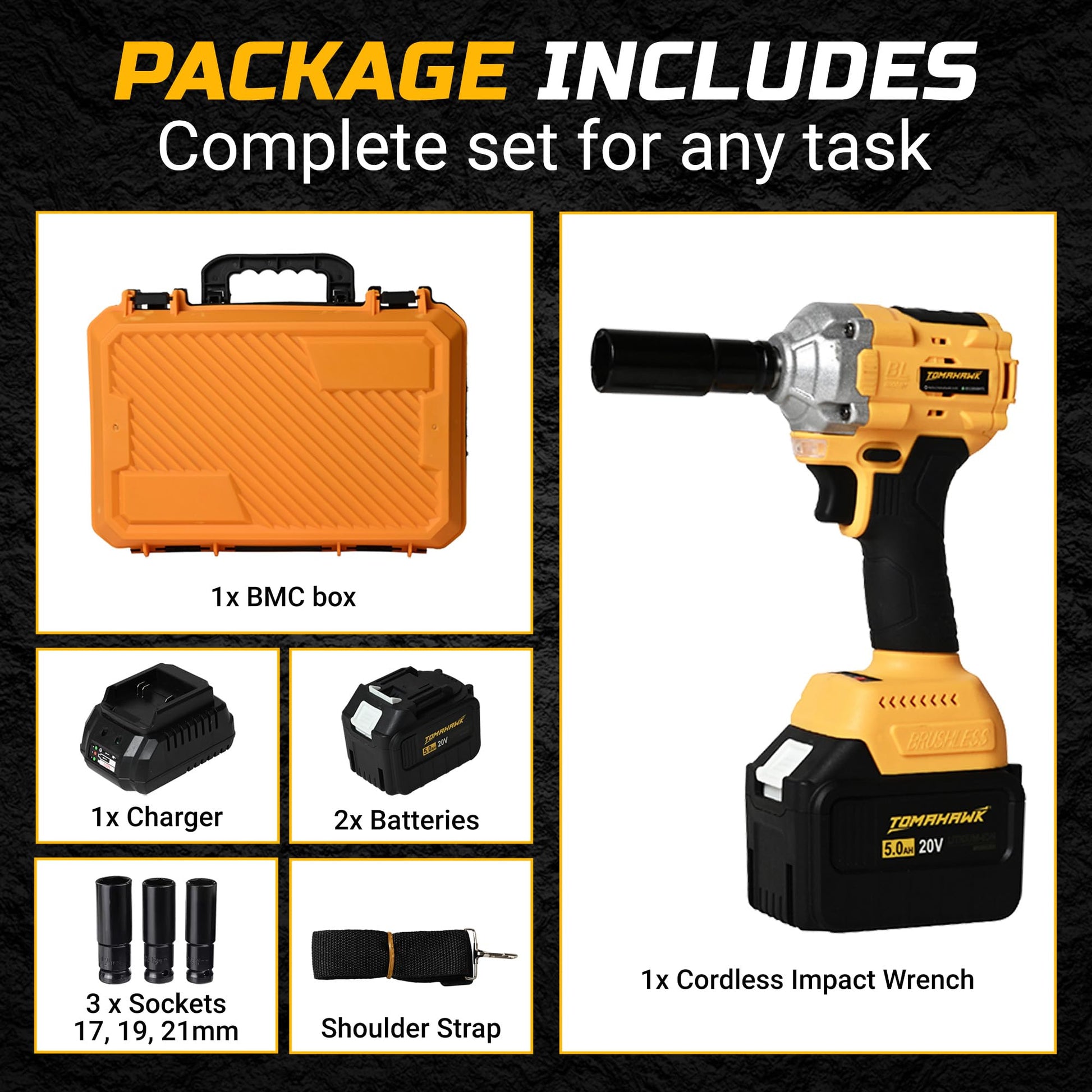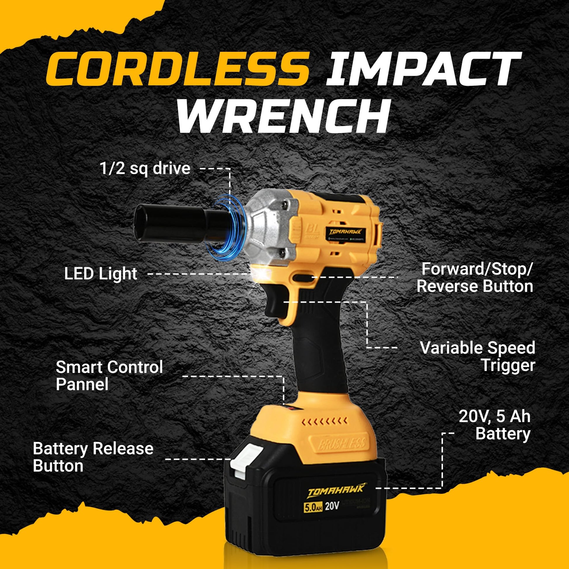 • The Tomahawk® T5252 Cordless Impact Wrench is a powerful and efficient tool designed for heavy-duty applications. Equipped with a brushless motor, this impact wrench delivers enhanced performance, durability, and efficiency for all your tough tasks. With a 1/2-inch drive and 300Nm of torque, the T5252 makes quick work of even the most demanding jobs, from car repairs to construction tasks.