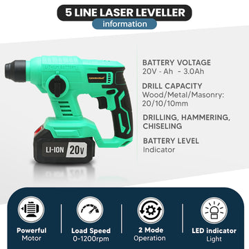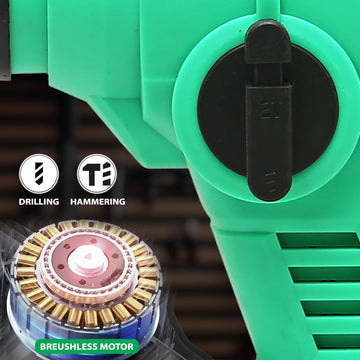 The TCR218 26mm Cordless Rotary Hammer delivers powerful performance with a no-load speed of 0-1200rpm and impact rate of 0-3500IPM. Equipped with a brushless motor and 2 modes for Hammering with rotation, it's ideal for a variety of tasks. It features a maximum drilling diameter of 26mm and a reversible function for added versatility. An LED indicator light ensures enhanced visibility in low-light conditions.