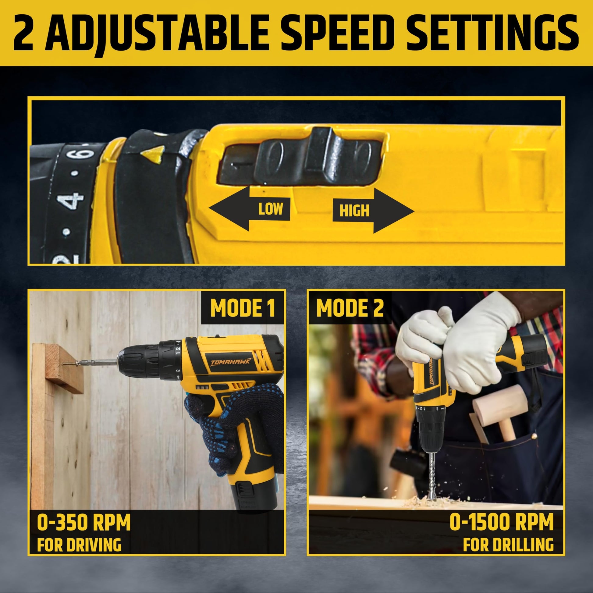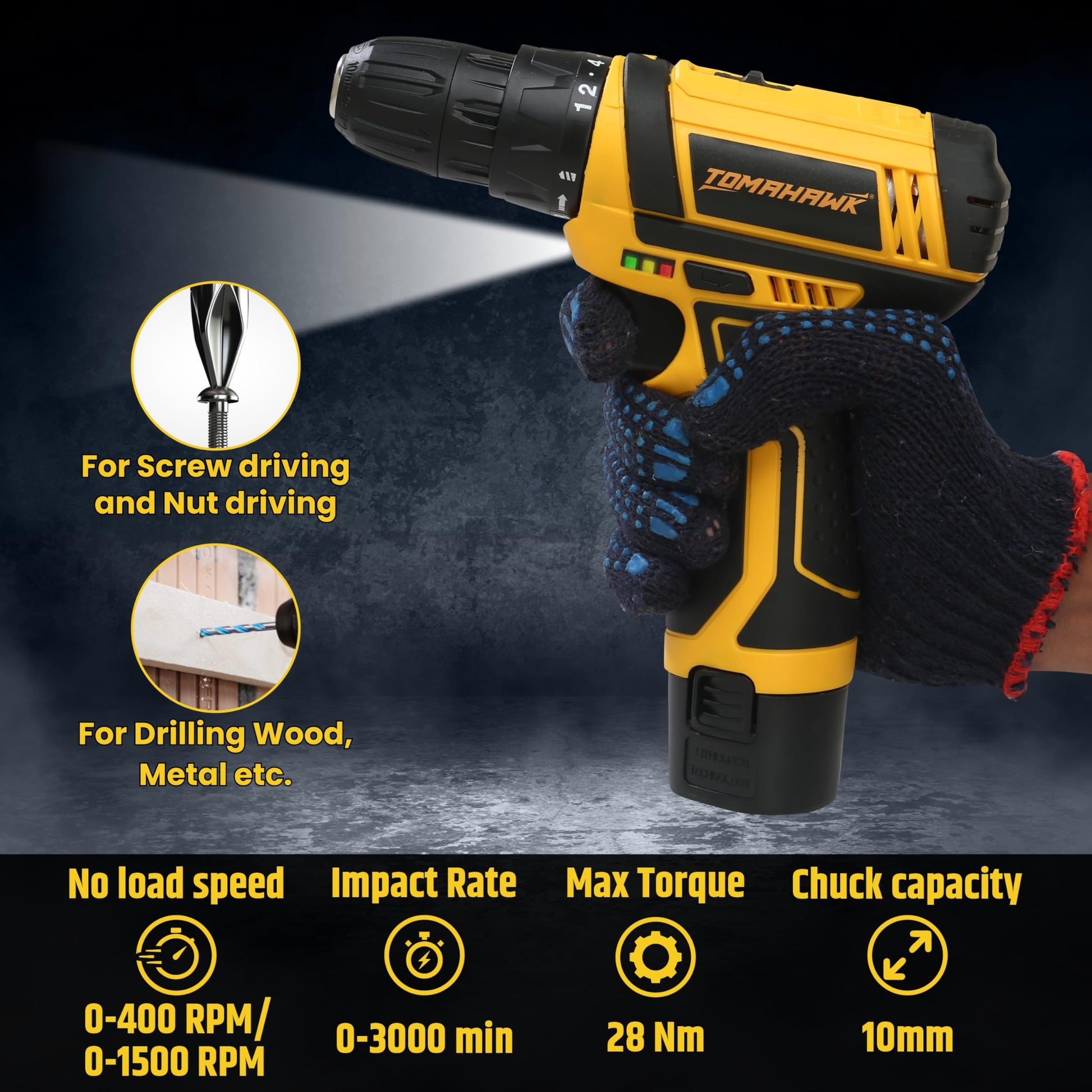 The Tomahawk DMD-4100 12V Cordless Drill/Screwdriver is a professional-grade power tool designed to deliver strength, precision, and reliability for home, DIY, and workshop applications. Its compact body, ergonomic design, and dual battery system make it an indispensable tool for any toolbox.