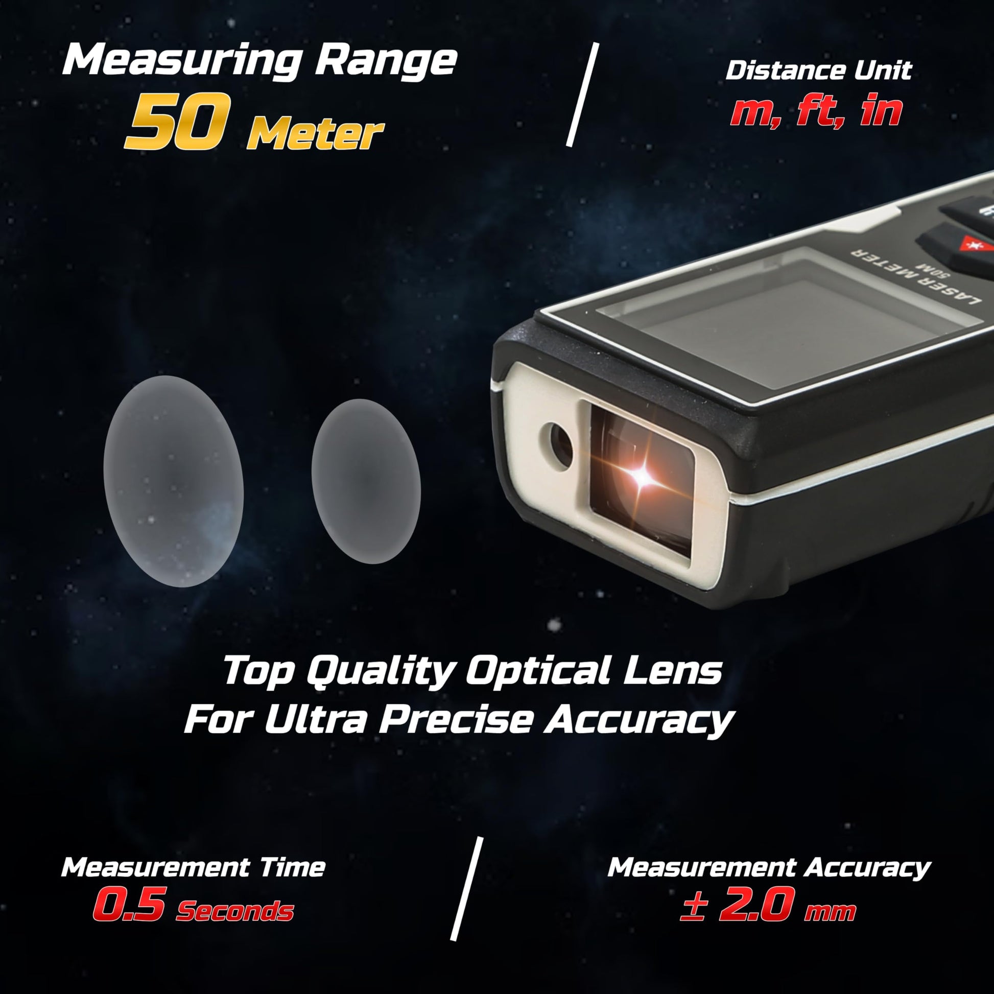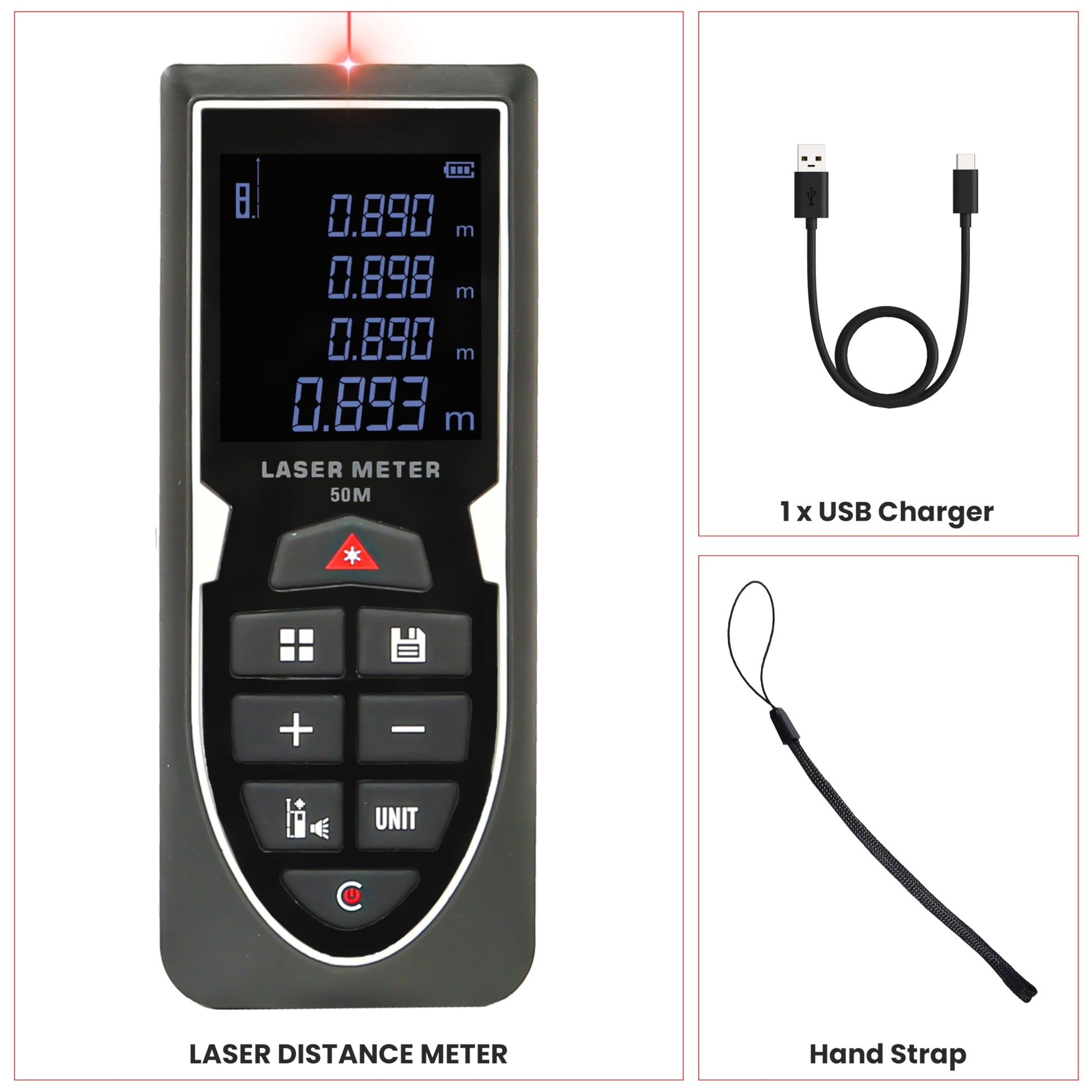 - The TOMAHAWK Laser Distance Meter BLA-0500 is an ideal tool for both professionals and DIY enthusiasts who require precision and durability. It offers a measuring range of 0.03 to 50 meters (164 feet) and provides an accuracy of ±2.0mm, delivering quick and reliable results in less than 0.5 seconds. Featuring multiple measuring modes, such as distance, area, volume, and Pythagorean calculations, it’s perfect for use in construction, architecture, landscaping, and real estate. Its IP54-rated waterproof and dustproof design ensures reliable performance even in challenging conditions, while the rubber casing provides enhanced grip and durability. The BLA-0500 is designed for user convenience with a clear two-line LCD backlit display for easy reading and simple operation. Weighing only 113 grams, its compact size, along with an included USB charger and hand strap, makes it portable and easy to carry. Additional features include storage functionality, addition/subtraction capabilities, and a clear-off function for effortless use. Whether measuring for electrical work or conducting surveys and mappings, the TOMAHAWK Laser Distance Meter is your go-to tool for accurate and efficient measurements.