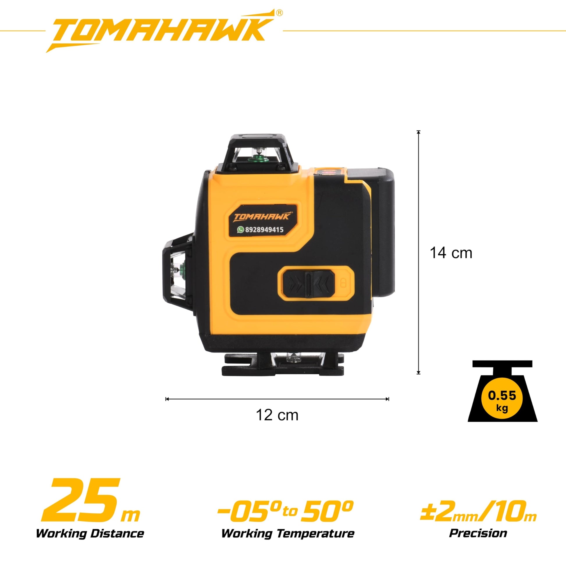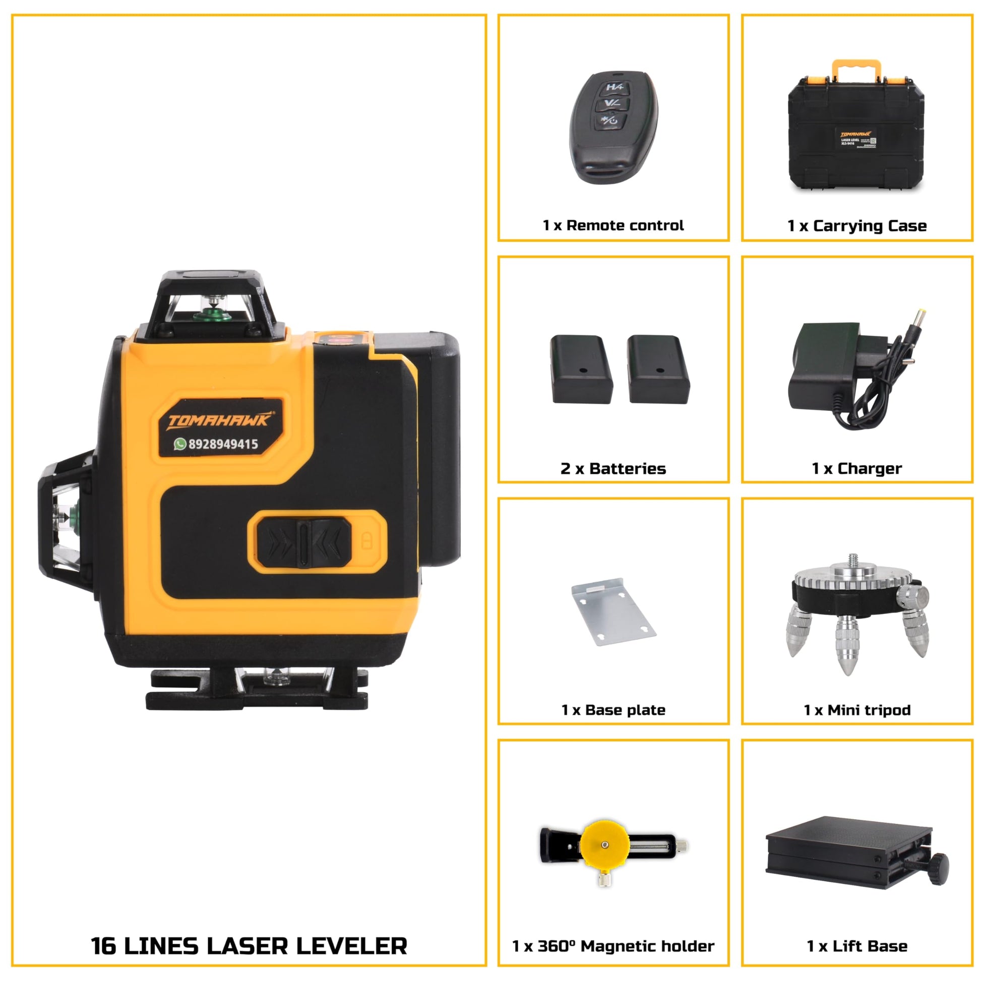 - The comprehensive package of the TOMAHAWK® XLS-9416 includes a 16 laser level machine, 360° magnetic holder, remote control, mini tripod, laser target plate, base plate, USB charger & adapter, user's manual, and a BMC box. This makes it a versatile and comprehensive solution for professional laser leveling tasks, perfect for construction and tile fitting projects.