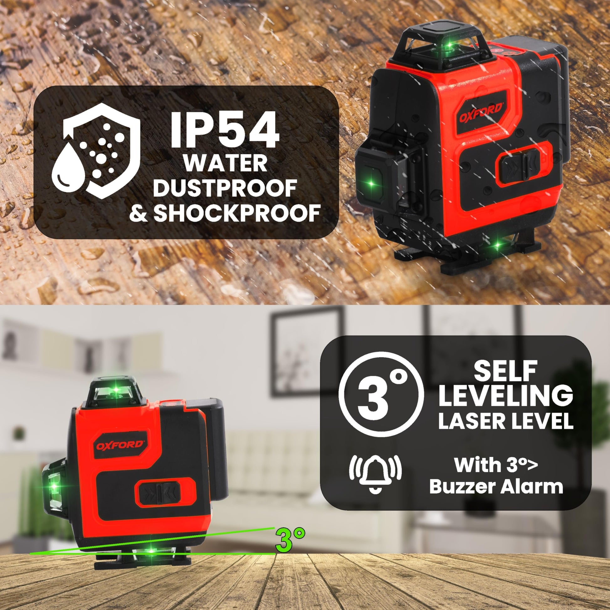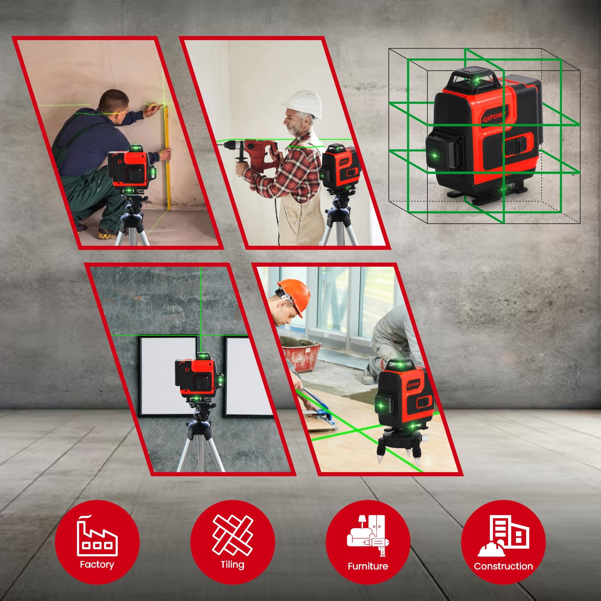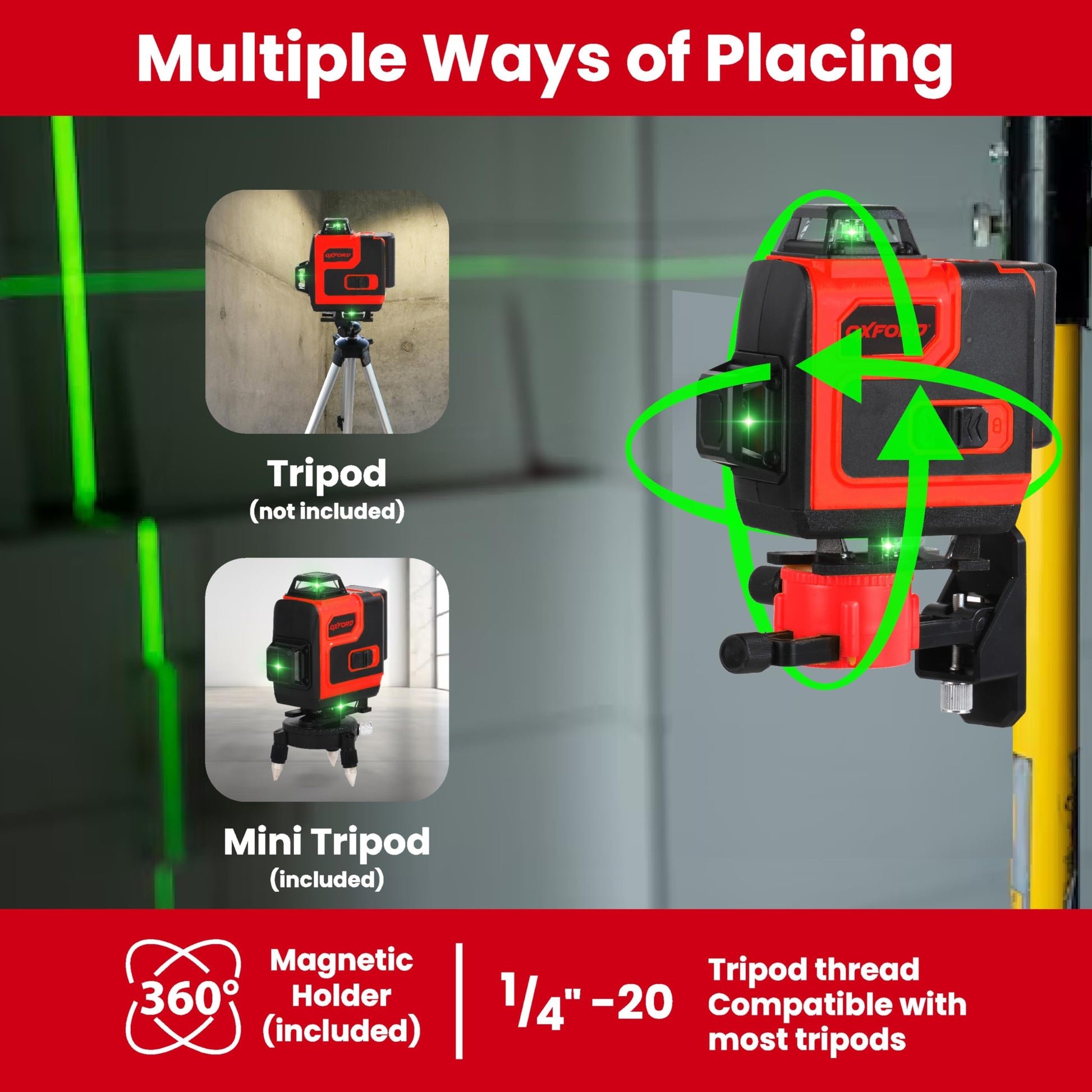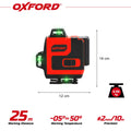 - The OXFORD® OXS-4708 16 Lines Green Laser Level Pro represents a significant advancement in precision alignment tools, designed for professionals who demand accuracy and efficiency. This 4x360° 4D green cross line laser projects four distinct 360-degree laser planes, effectively creating a comprehensive grid for seamless leveling and alignment across entire rooms. Two horizontal and two vertical laser lines intersect to form a perfect 4D cross, simplifying tasks such as installing drop ceilings, aligning tiles, or framing walls. The use of a bright green laser, significantly more visible than traditional red lasers, ensures clear line visibility even in well-lit environments. For added versatility, this laser level features a pulse mode, allowing for extended range and outdoor use when paired with a compatible laser detector. The included remote controller provides unparalleled convenience, enabling users to adjust laser settings and switch between modes without needing to physically access the device. This feature significantly enhances workflow and reduces setup time. Built for durability and precision, the TOMAHAWK® 16 Lines Green Laser Level Pro is an indispensable tool for construction professionals, contractors, and DIY enthusiasts who require reliable and accurate alignment solutions.