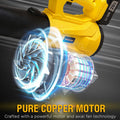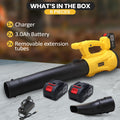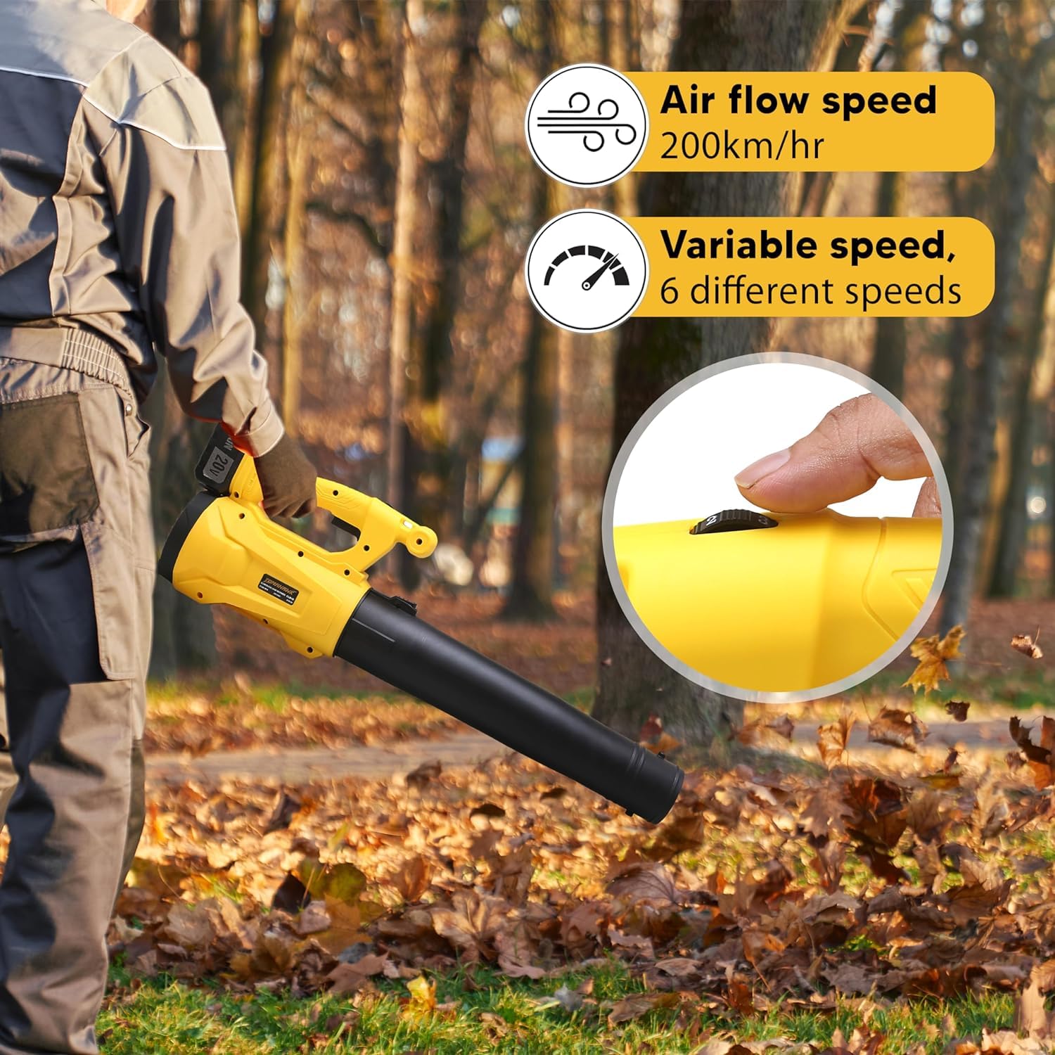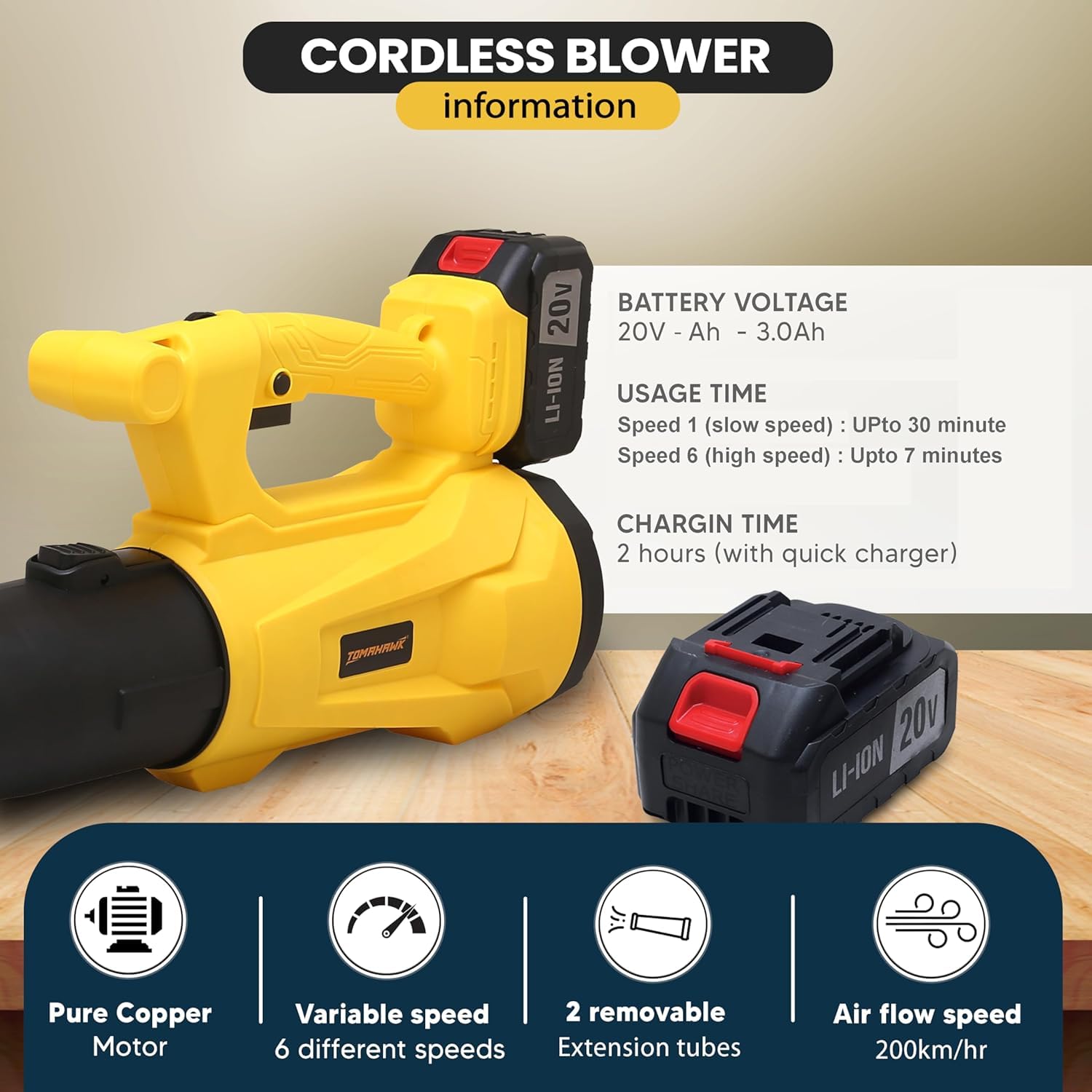 - The TOMAHAWK TLB040 Cordless Leaf Blower is designed for powerful, efficient cleaning across a variety of settings. Equipped with a pure copper motor, it delivers an airflow speed of 200 km/h and a maximum air volume of 450 CFM, making it perfect for leaf blowing, dust removal, landscaping, gardening, construction sites, and poultry farm feather cleaning. Its lightweight design—just 1.9 kg with battery and 1.4 kg without—combined with ergonomic handling, allows you to clean large areas or tight spaces comfortably. The blower features variable speed control with 6 settings, letting you adjust airflow for delicate or heavy-duty tasks. Powered by a 20V 3Ah battery, it ensures extended runtime, while the included fast charger keeps downtime to a minimum. Additional conveniences include 2 removable extension tubes and a self-lock button for safe, continuous operation. Durable, versatile, and easy to use, the TOMAHAWK TLB040 is the perfect tool for a cleaner.