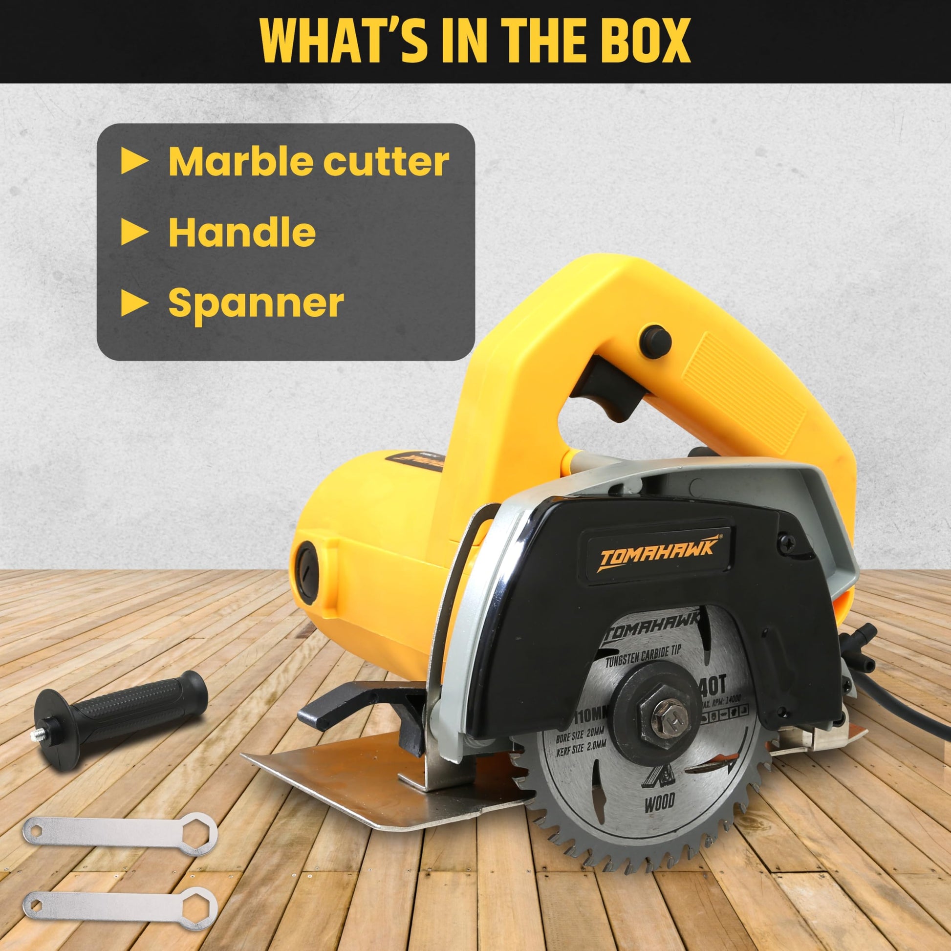 - Introducing the TOMAHAWK® TCM8A 1050W 4”/110mm Heavy Duty Marble Cutter TCM8A, a versatile and powerful tool designed for a wide range of cutting and grinding tasks. With a robust 1050W motor, this cutter achieves a no-load speed of 0-8500rpm, making it ideal for working with materials such as marble, granite, wood, and stone.