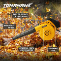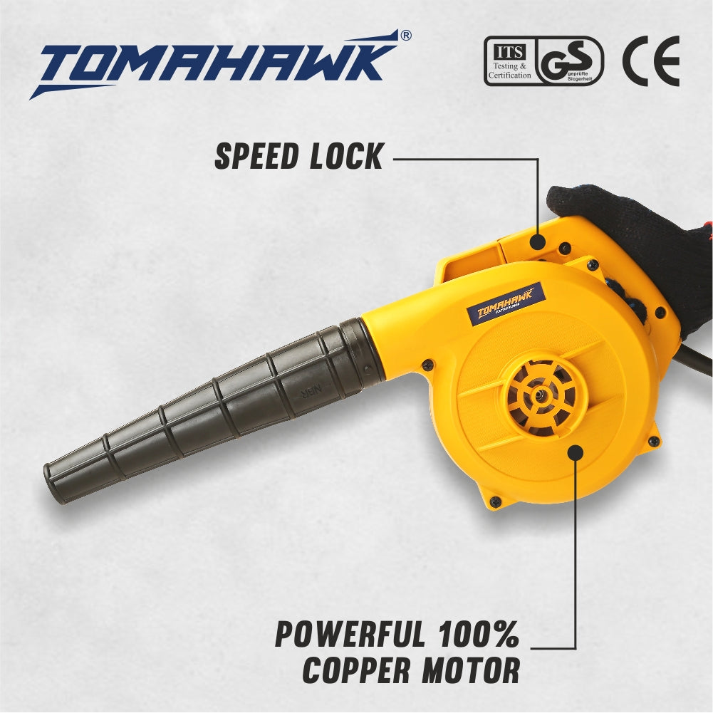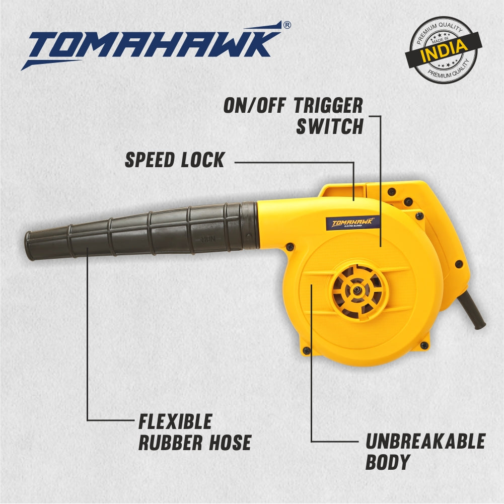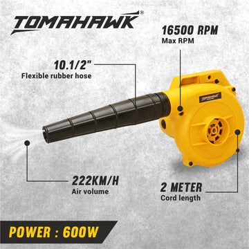 The Tomahawk's T100 Electric Blower features a powerful 600W motor, achieving a maximum RPM of 16,500 and airflow up to 222 km/h. It includes a 10.5” flexible rubber hose and 1.8-meter cord for versatile application. Built with a durable ABS body and 100% copper components, it ensures long-lasting performance. Proudly made in India, it also incorporates a speed lock for consistent operation.