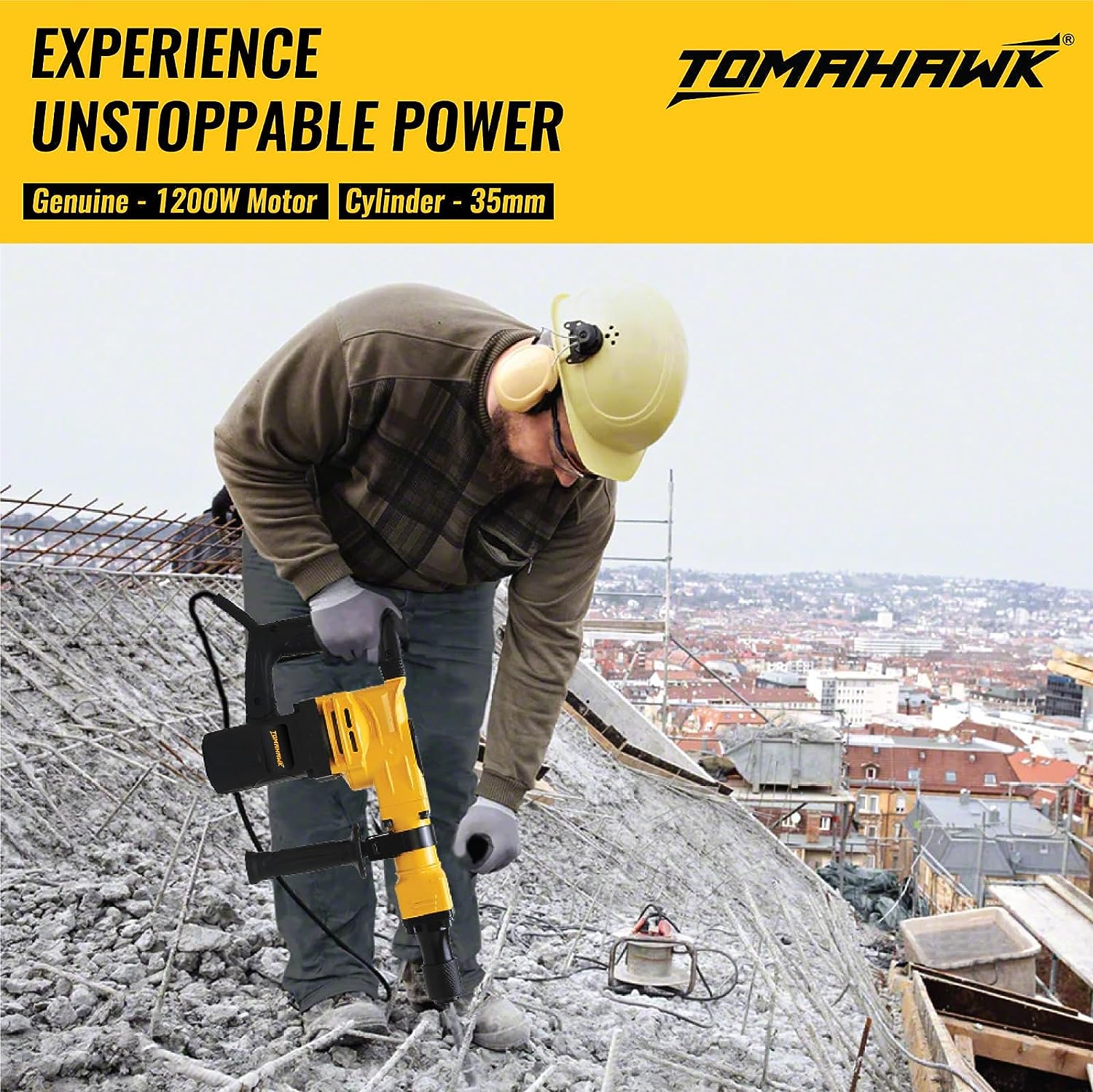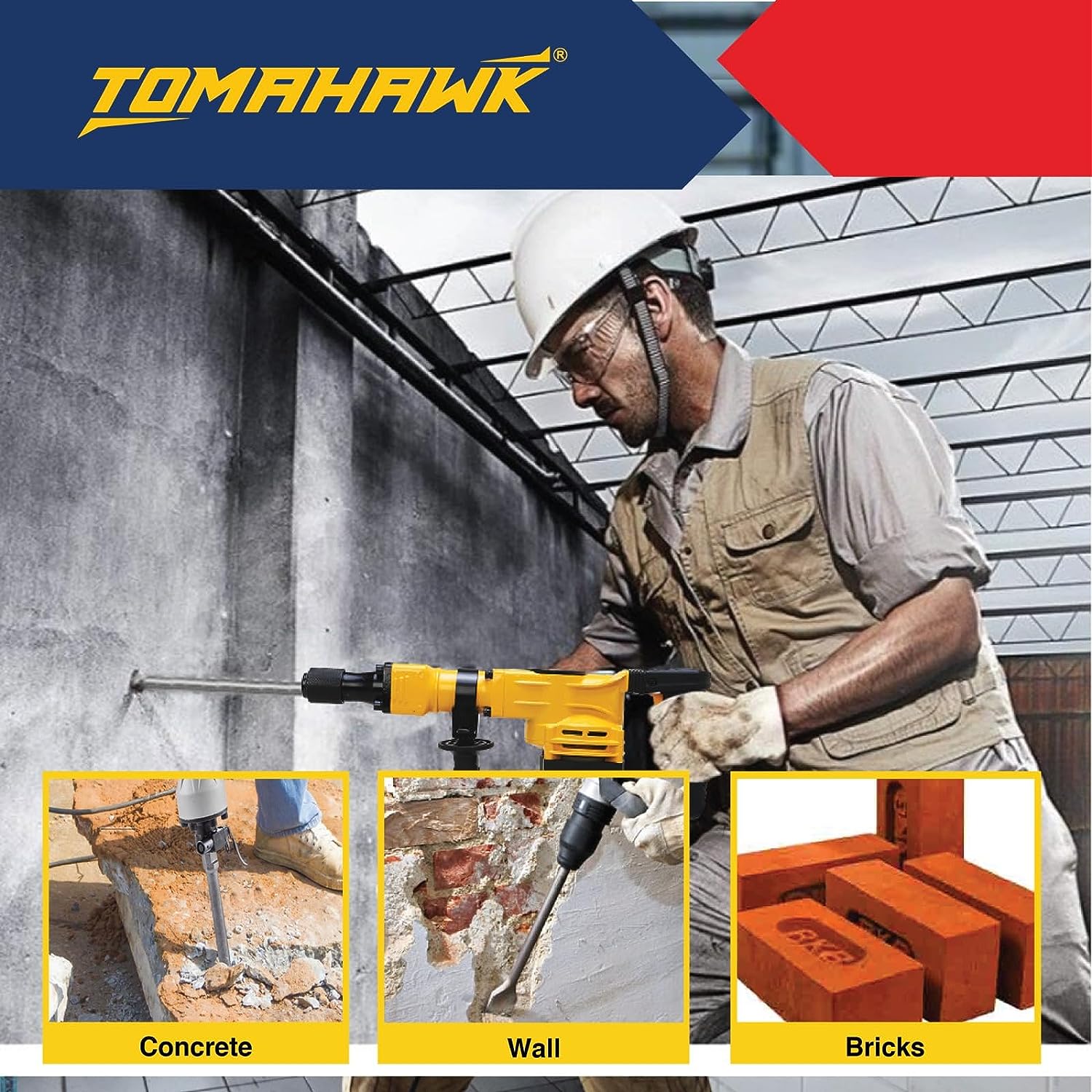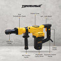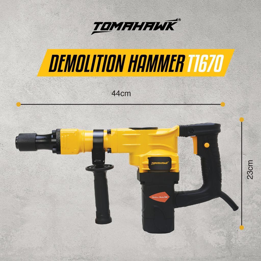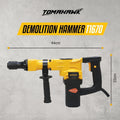 The T1670 Demolition Hammer delivers powerful 1200W performance with a speed of 3200 RPM, perfect for heavy-duty tasks. Its dual-handle design offers comfort and 360-degree usability, while the durable copper-core motor ensures long-lasting power. Comes with two chisels for versatile demolition work, ideal for breaking through concrete, brick, and more.
