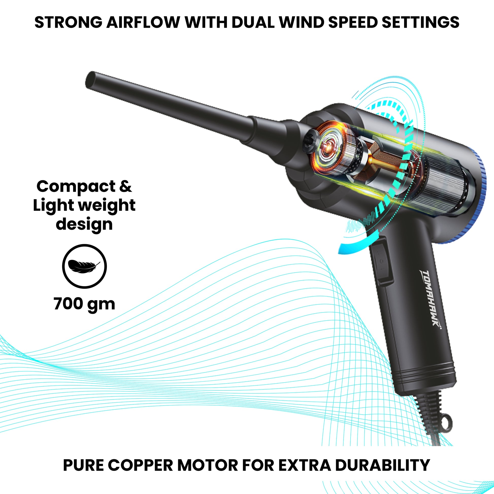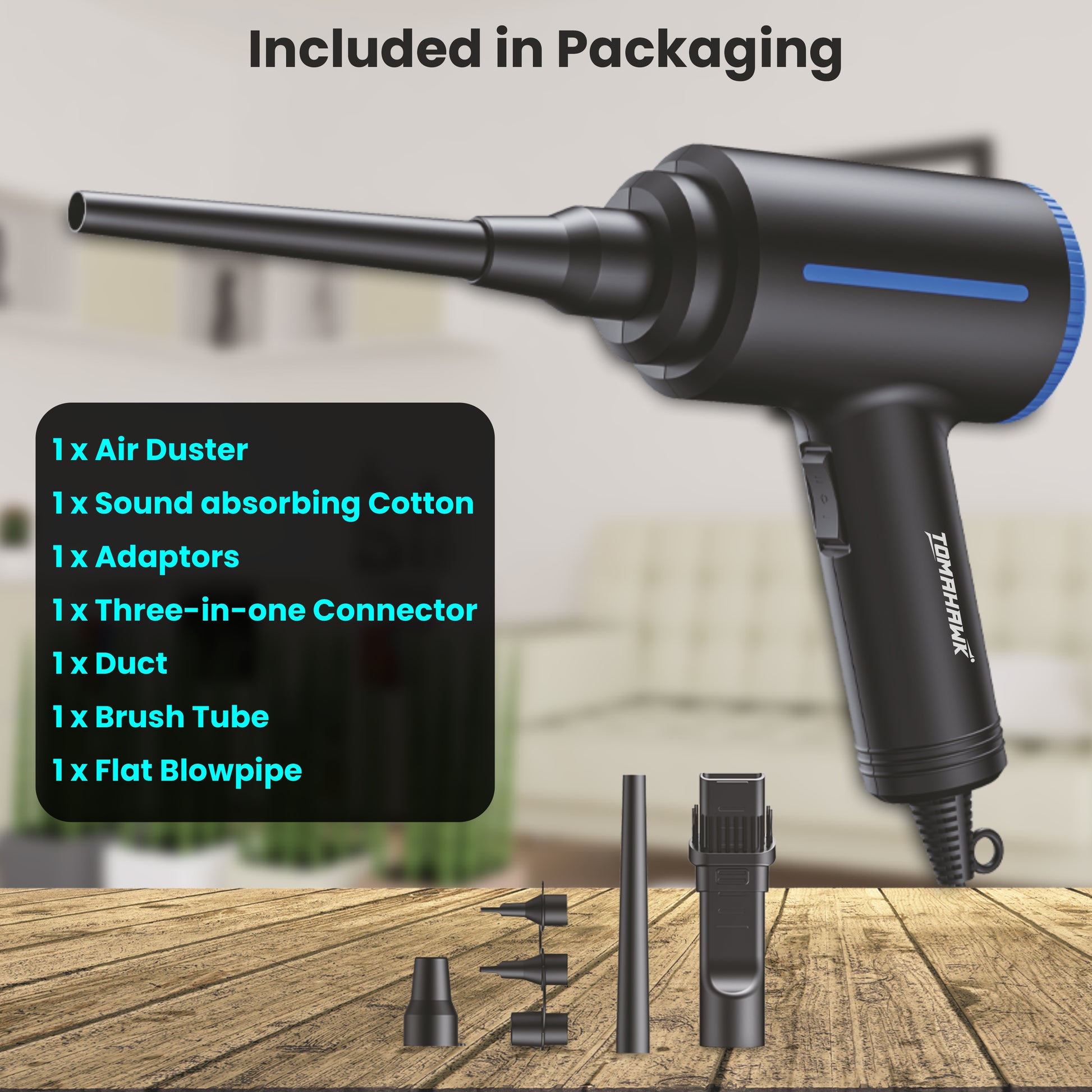 The TCD 333 Compressed Air Duster is a versatile and lightweight blower designed for cleaning electronics, inflatables, and hard-to-reach areas. Equipped with a 100% copper motor, it offers reliable performance with dual power modes (260W/500W) and a 3-meter cord for extended reach. Featuring 2-speed gear control and a reusable sponge filter, it’s an efficient, eco-friendly alternative to canned air ideal for both home and professional use.