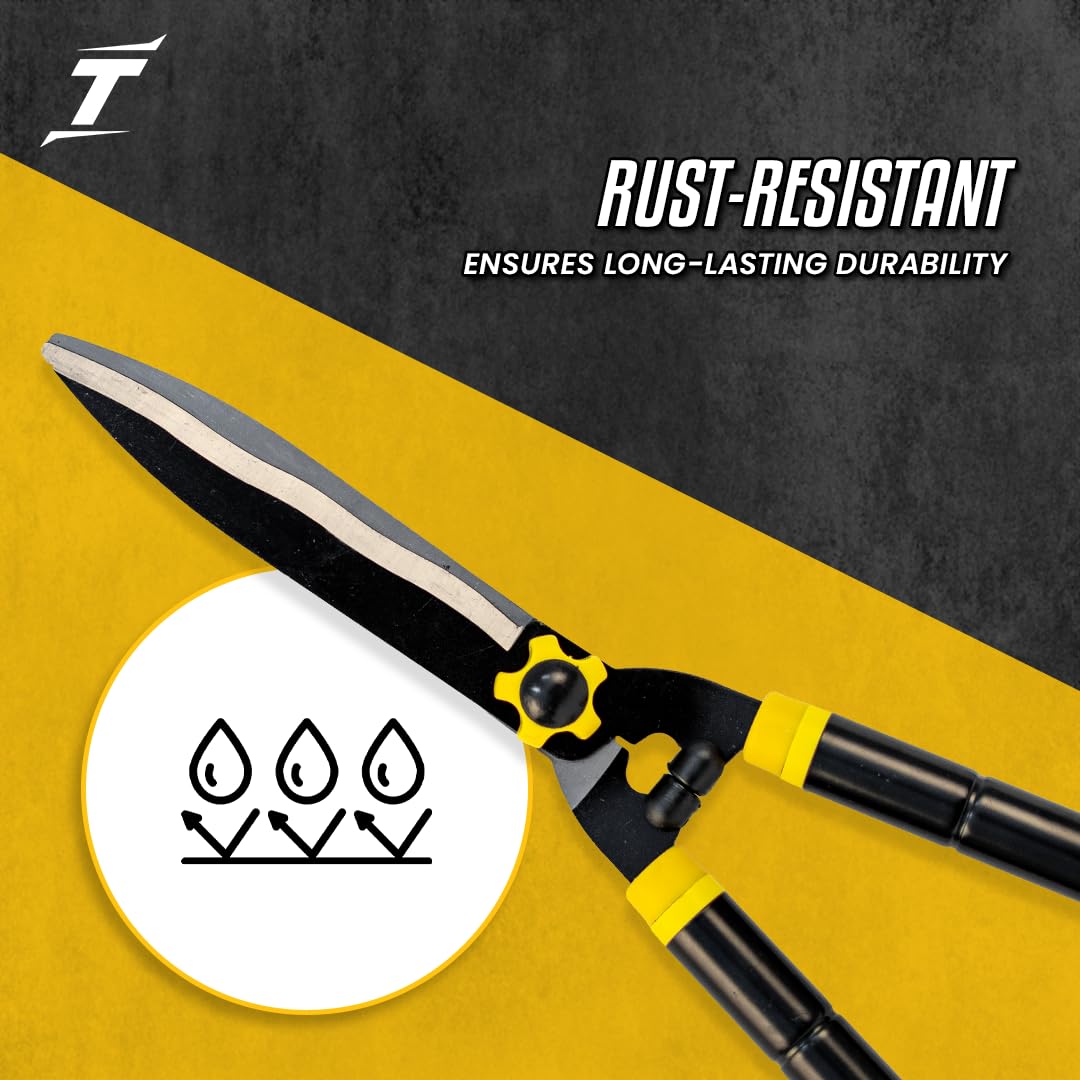 - The TTS29 hedge shear telescopic handle features sharp high-carbon steel blades for precise cutting. It extends up to 30” for easy reach of tall or dense hedges. Rust-resistant construction ensures durability, while ergonomic handles provide comfort during use. Adjustable tension allows for customized cutting control to suit every task.