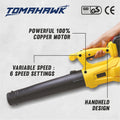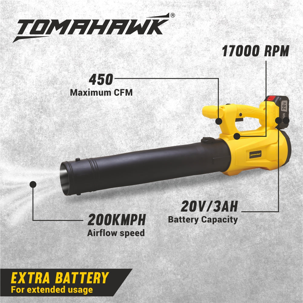 The TLB040 cordless leaf blower combines a powerful pure copper motor with an impressive airflow speed of 200 km/h and a no-load speed of 0-17,000 RPM. It features a 3Ah battery and a maximum air volume of 450 CFM for efficient performance. Enjoy customizable blowing with 6 variable speeds, and convenience with a self-lock button, fast charger, and two removable extension tubes for versatile use.