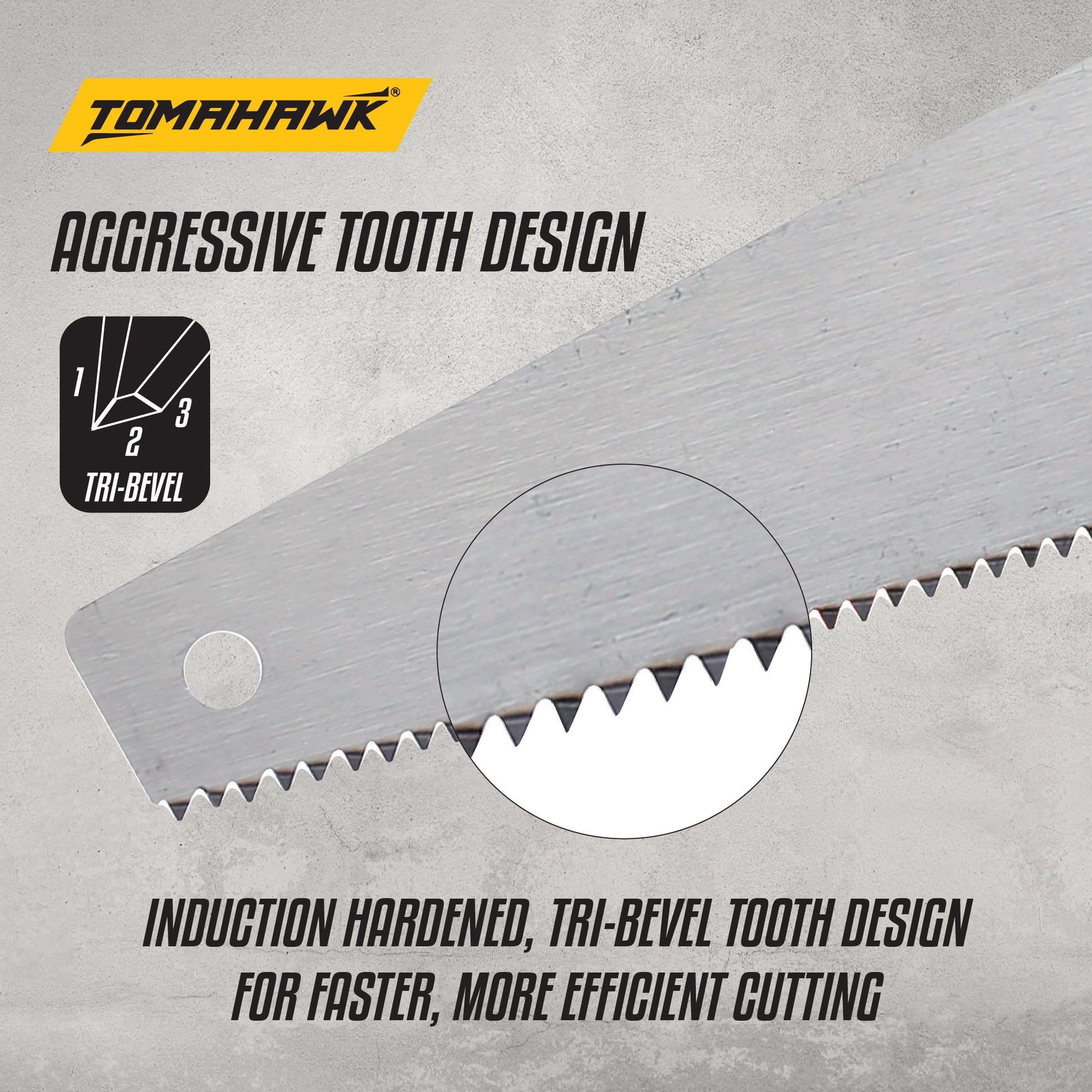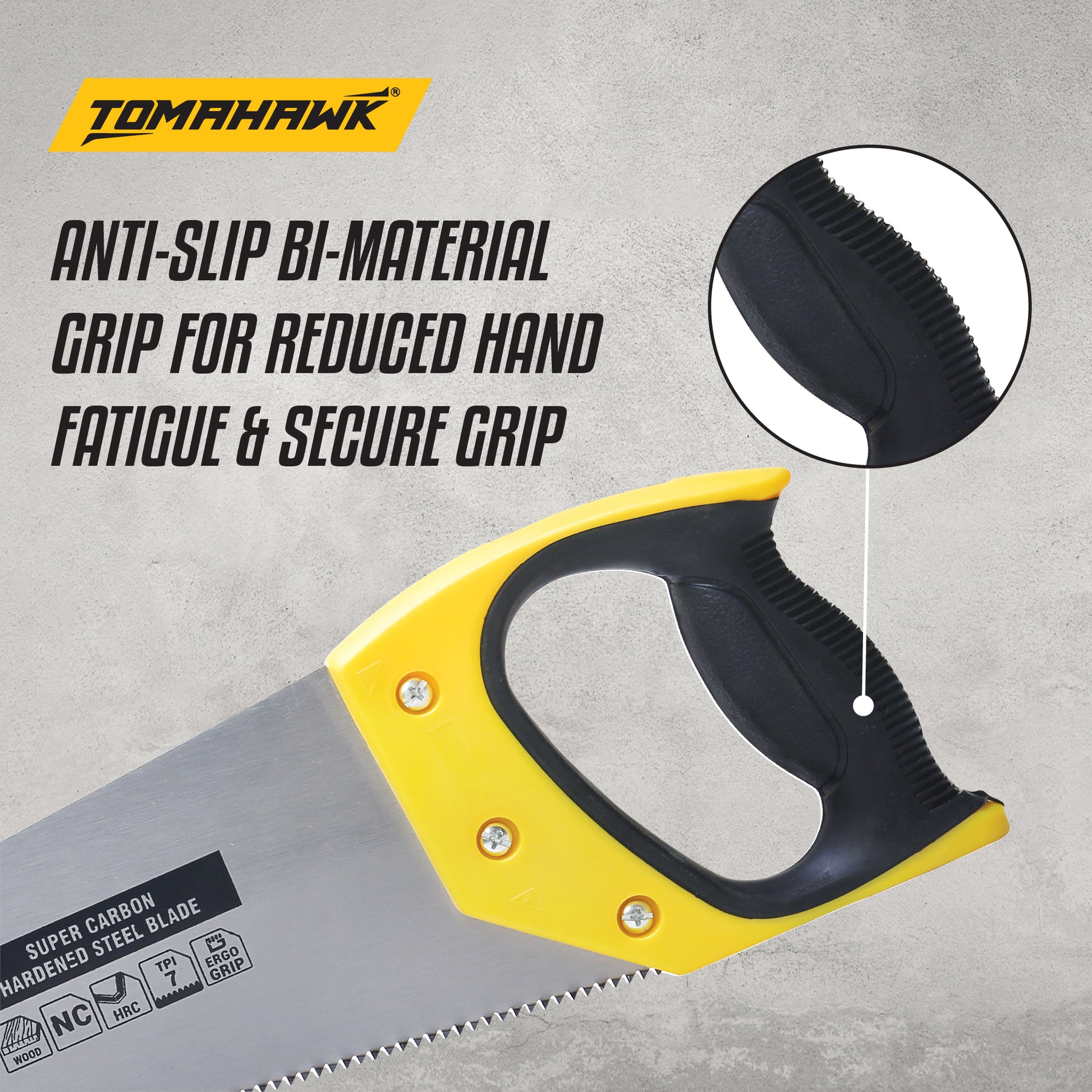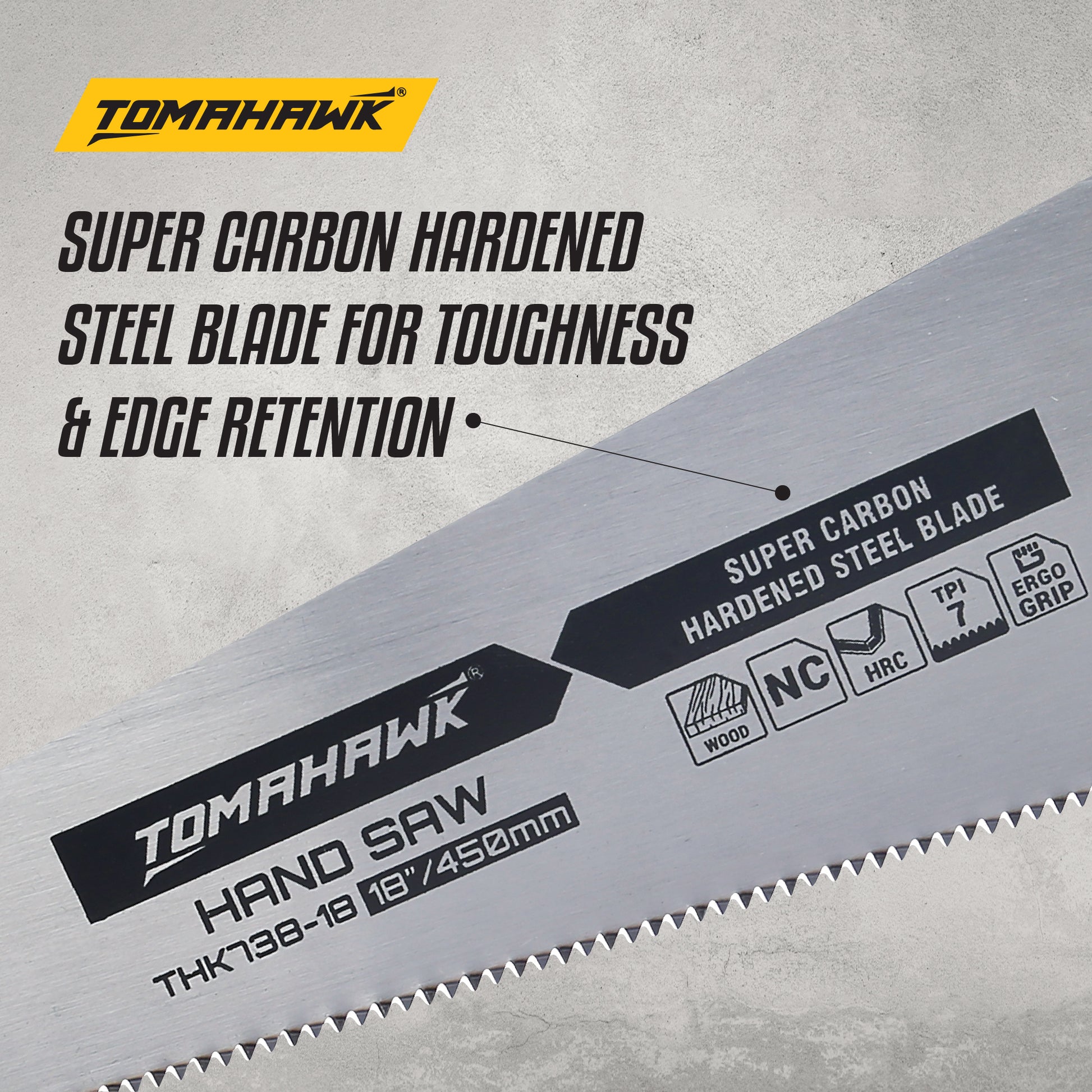 Introducing the Tomahawk's THK738-18 hand saw, equipped with a super carbon hardened steel blade offering outstanding durability and cutting power. Its aggressive tooth design guarantees fast and efficient cuts through wood and other materials. The anti-slip BI material grip ensures comfort and control, minimizing fatigue during use. Ideal for both DIY enthusiasts and professionals, this wood saw is an essential tool for any project!