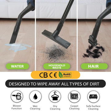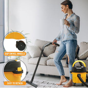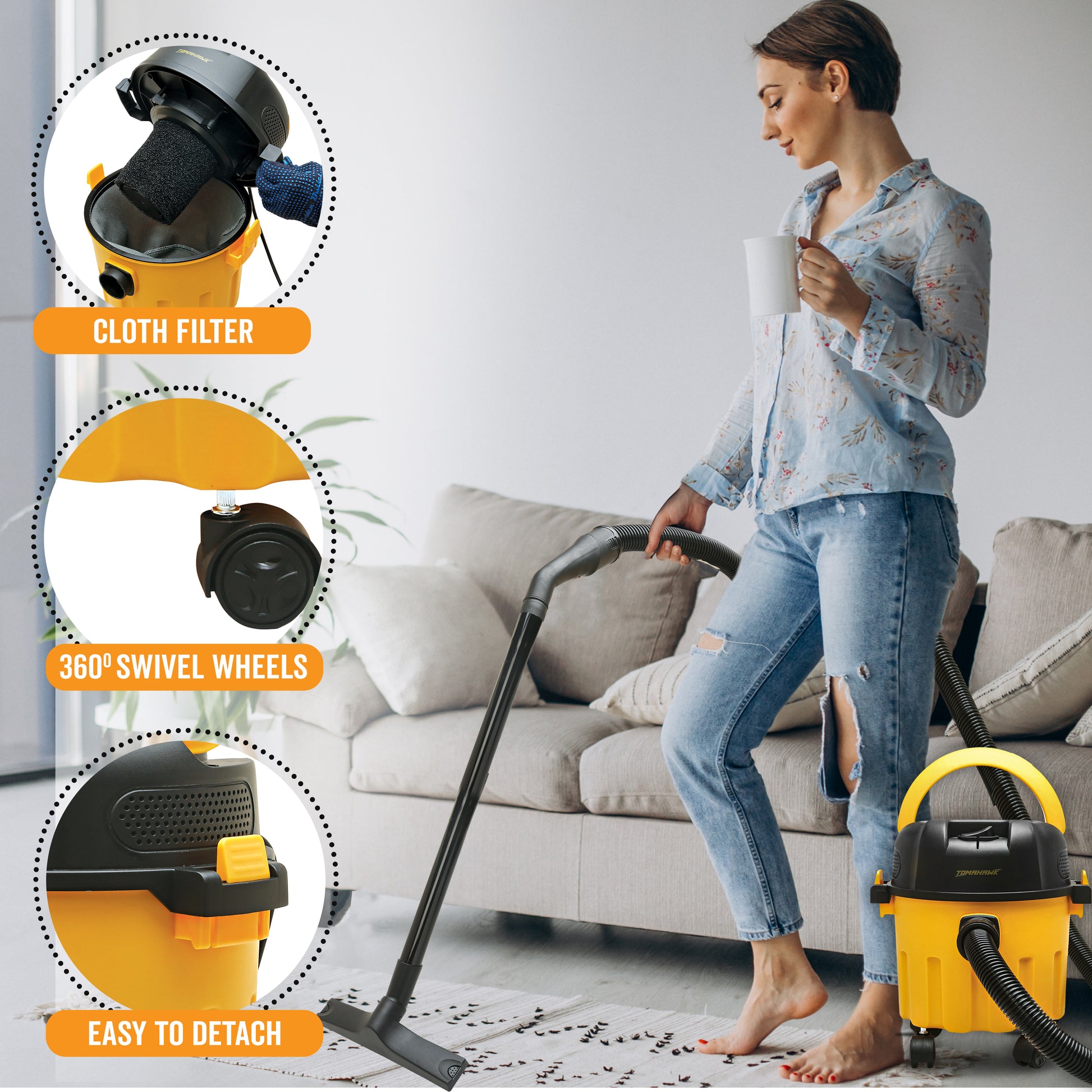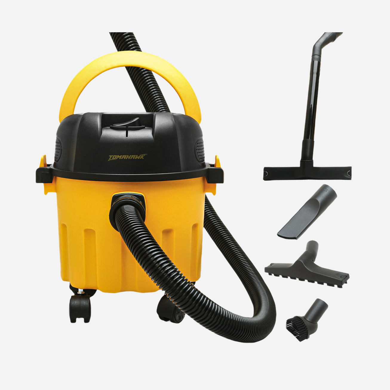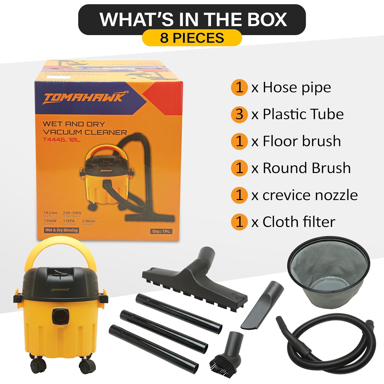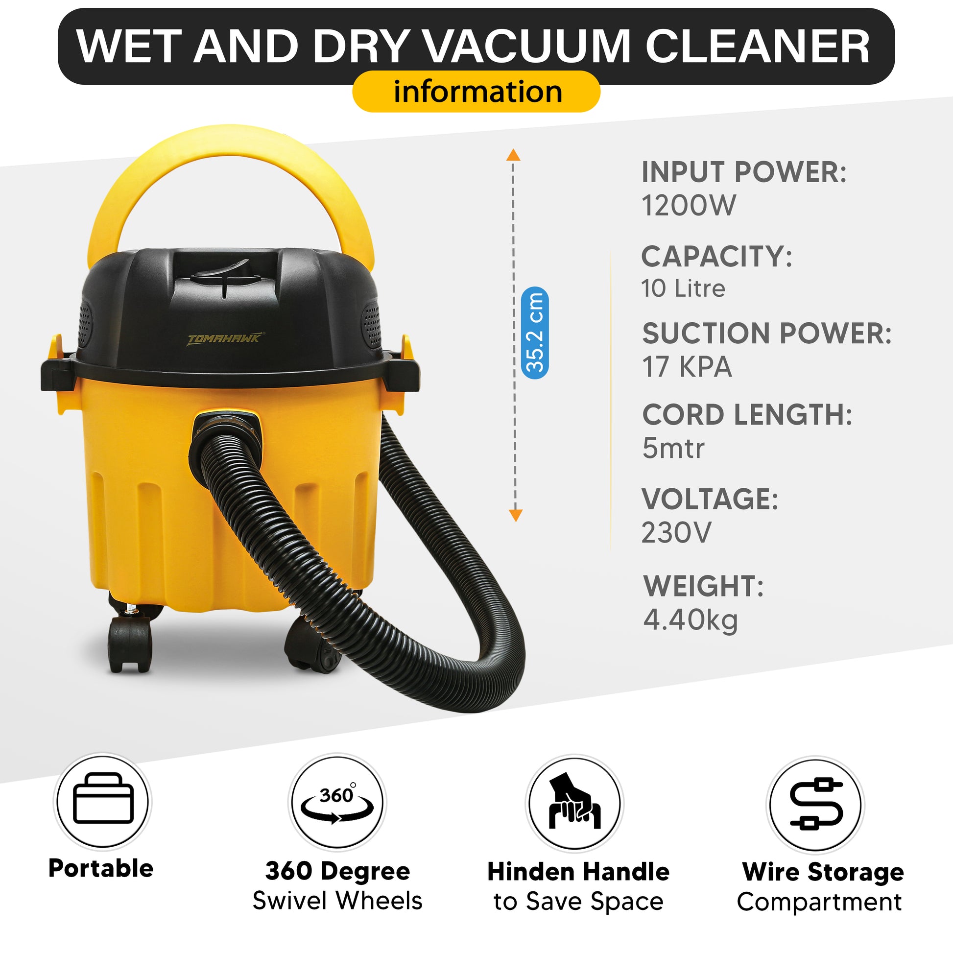 Introducing the Tomahawk's T4446 Wet and Dry Vacuum Cleaner, crafted for powerful performance with a 1200W motor and 17 KPA suction power. Its ample 10-liter capacity and 5-meter cord are perfect for efficiently tackling both liquid and dry debris. Featuring 360-degree swivel wheels for smooth maneuverability, a hidden handle for space-efficient storage, and a wire compartment, this vacuum suits any home or workshop. Discover effortless cleaning with versatility and convenience at your fingertips!